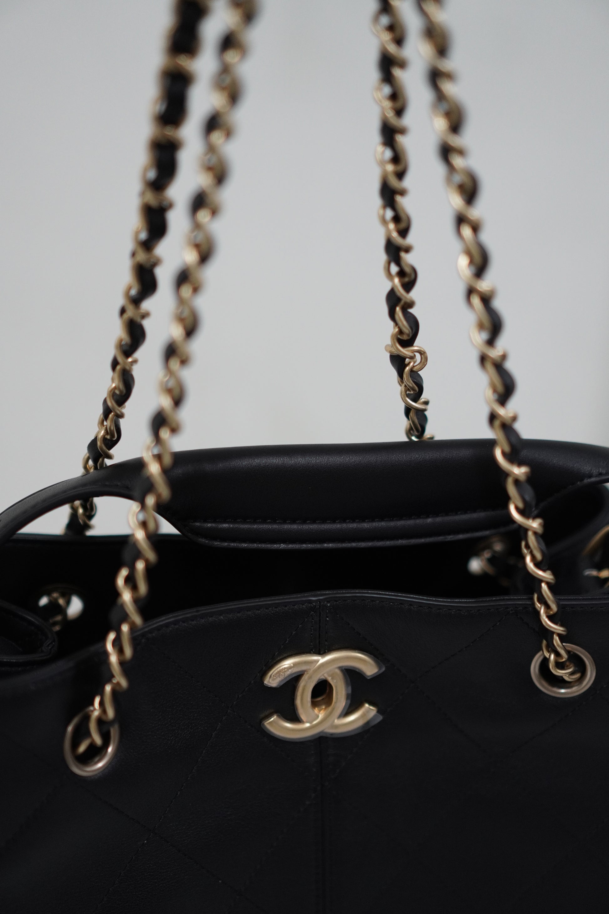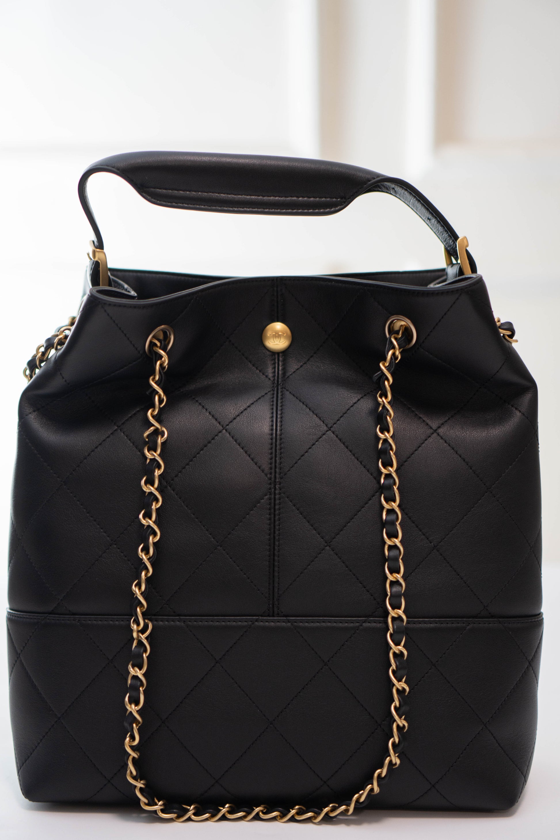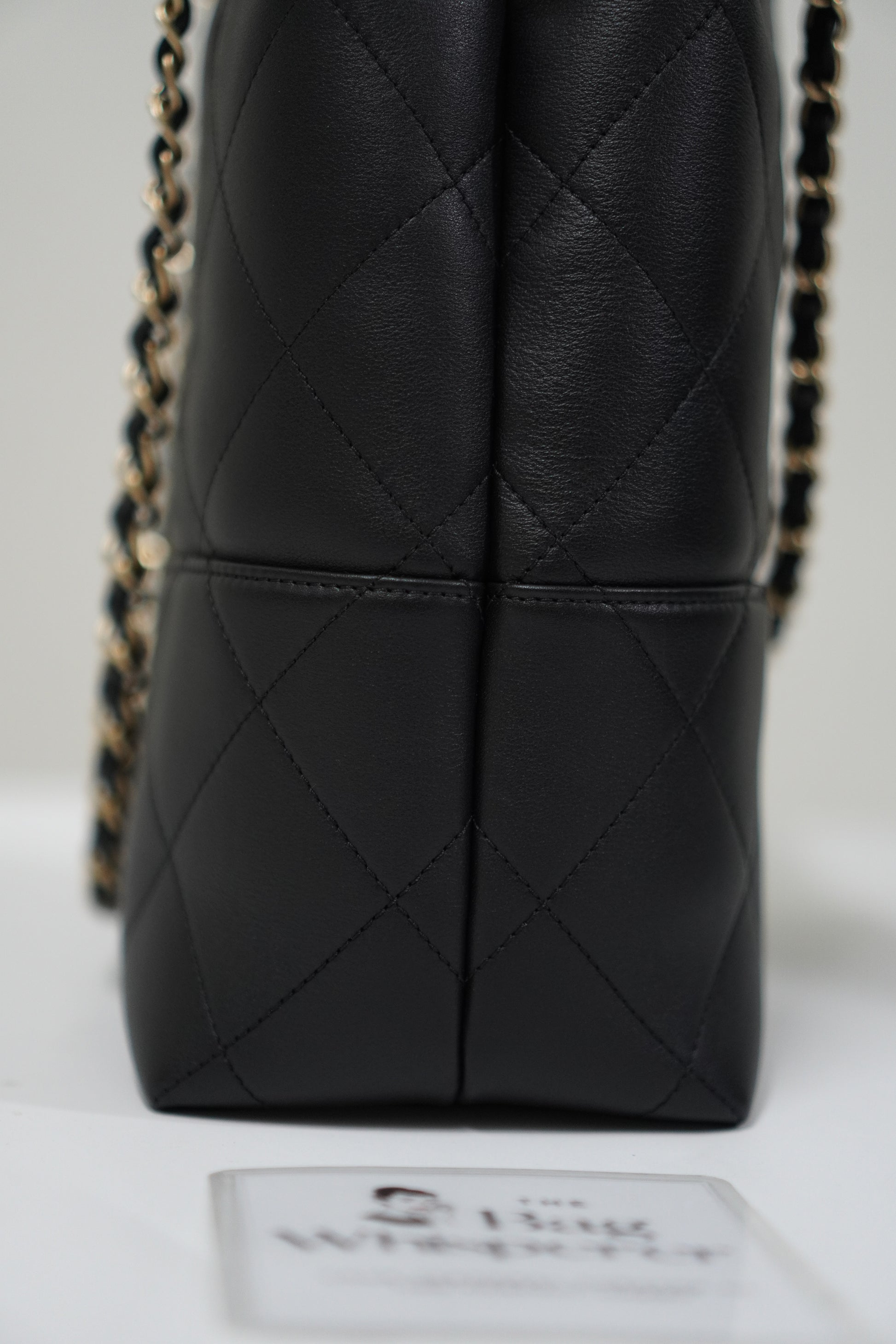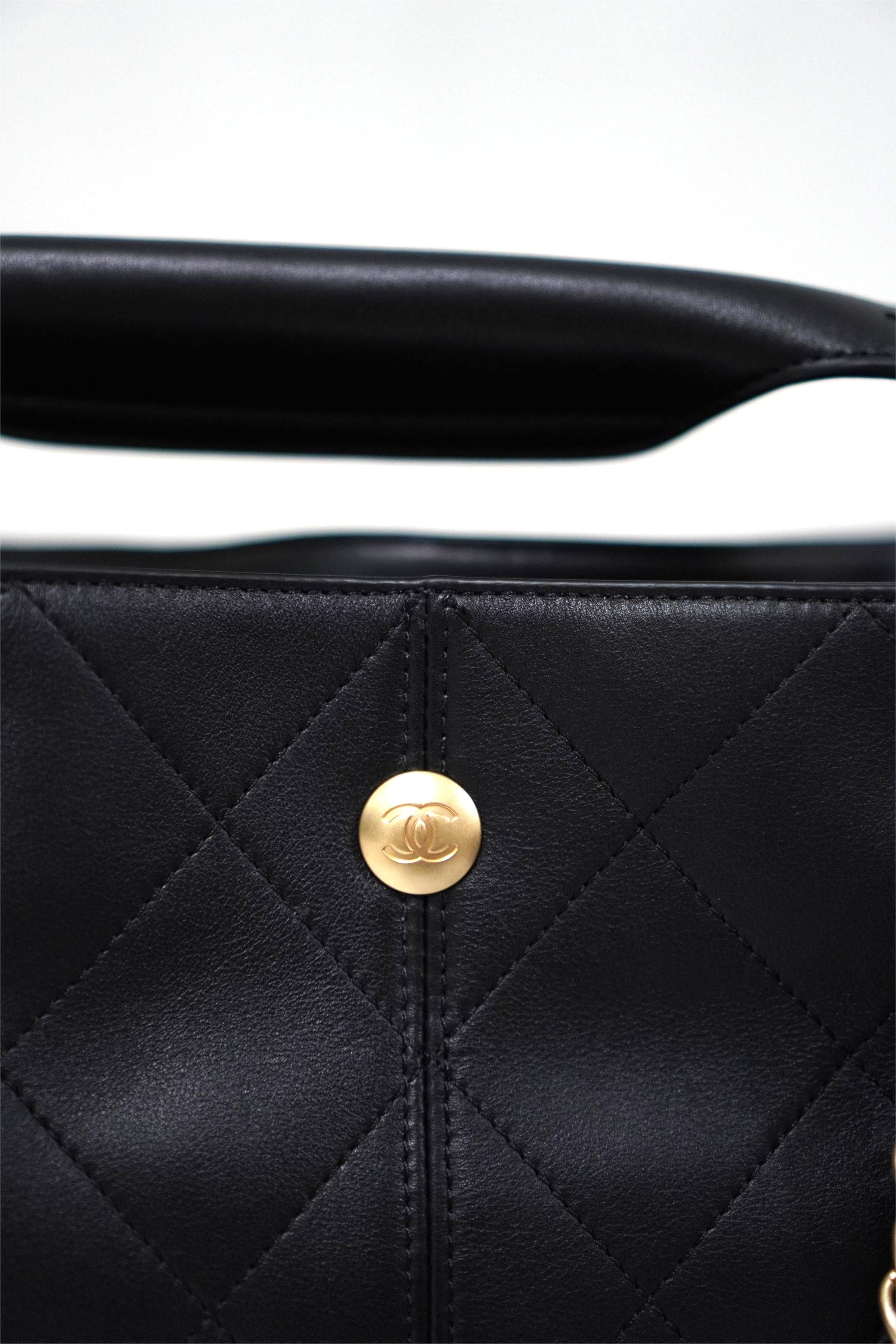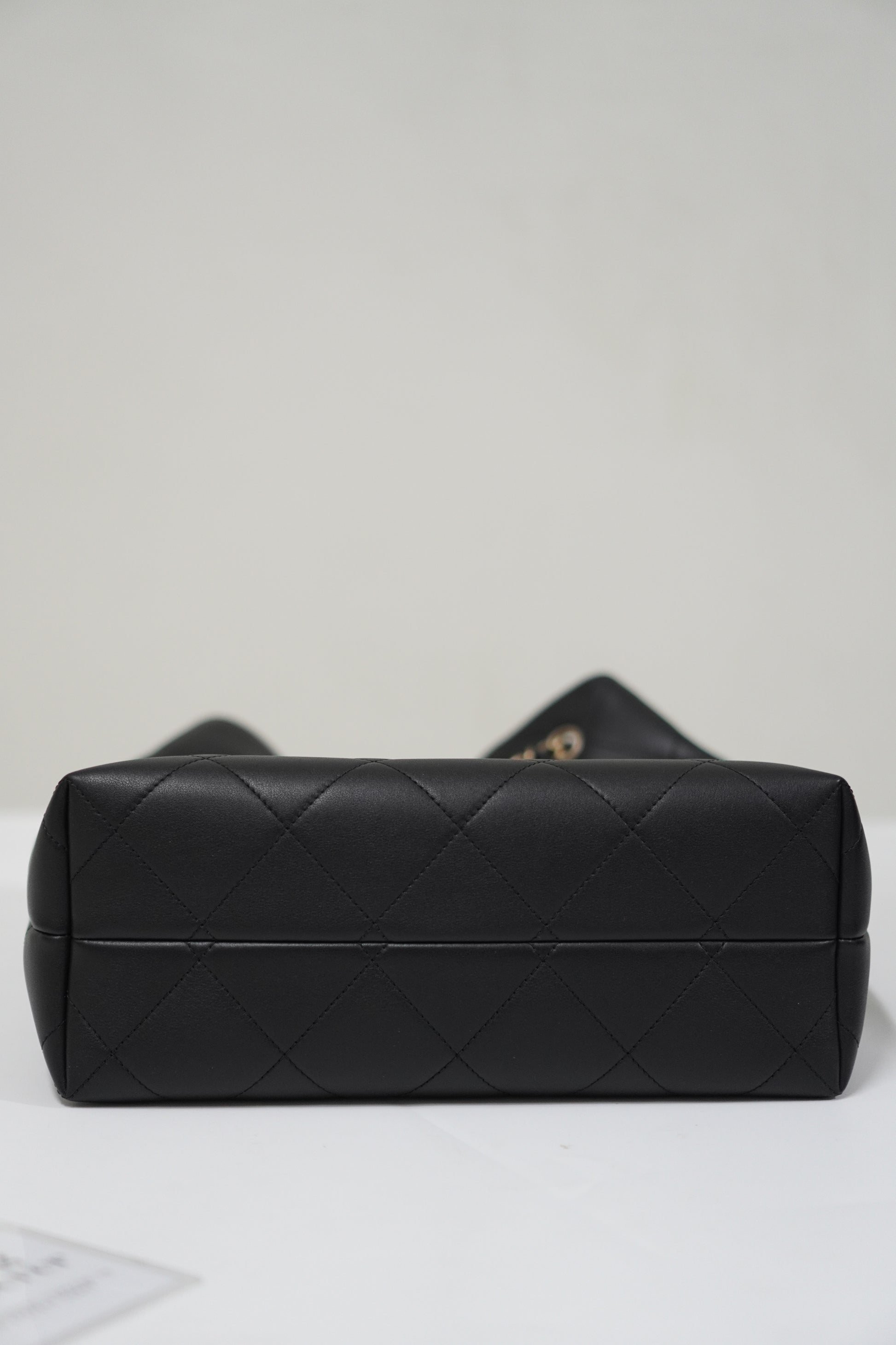A spacious yet polished everyday companion, this 25A Shopping Bag in Durable Lambskin combines a soft, slouchy structure with elegant diamond quilting for a refined, elevated look. The supple lambskin drapes beautifully while maintaining a luxurious feel, and the gold-tone chain-woven straps add a classic, effortless finish.