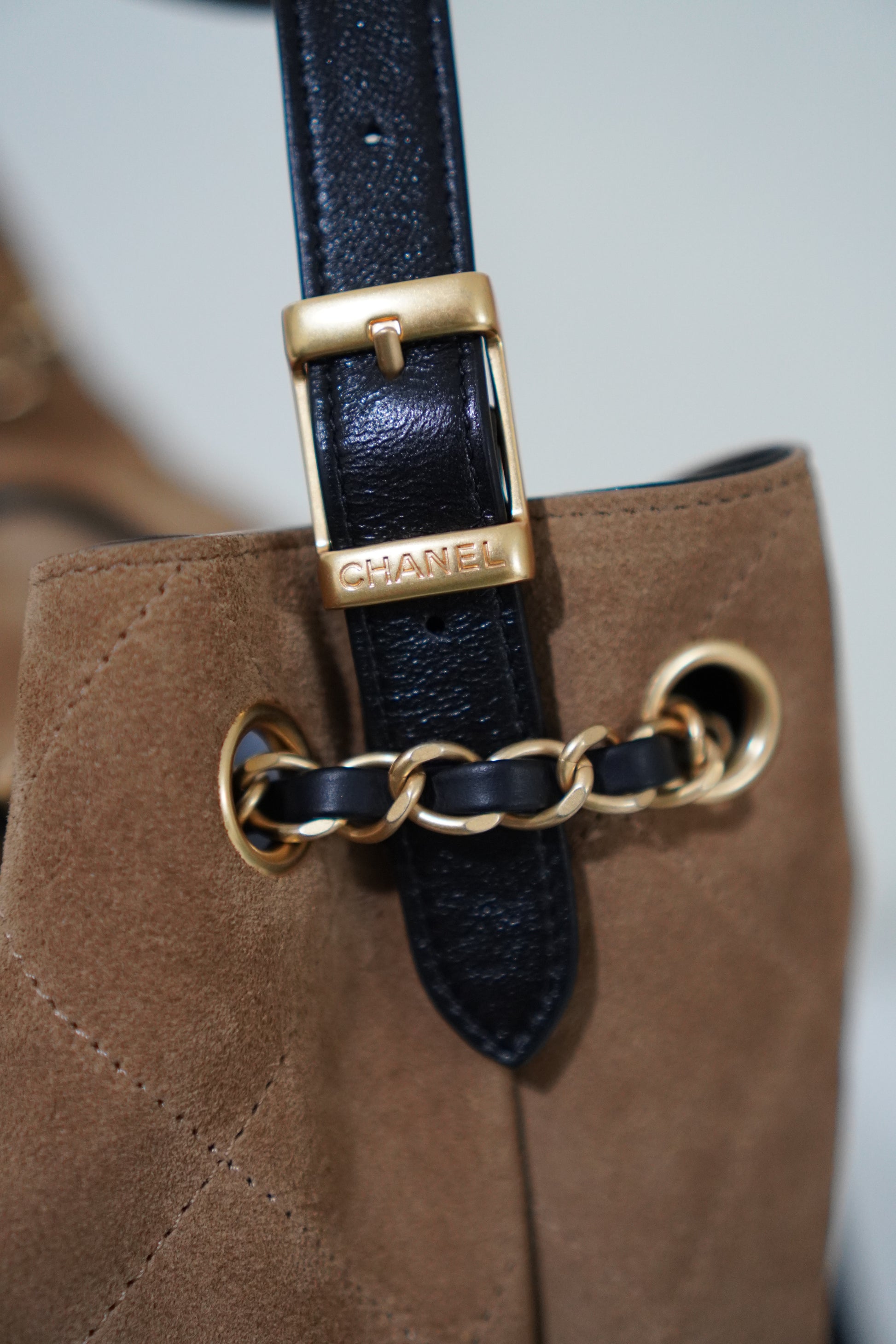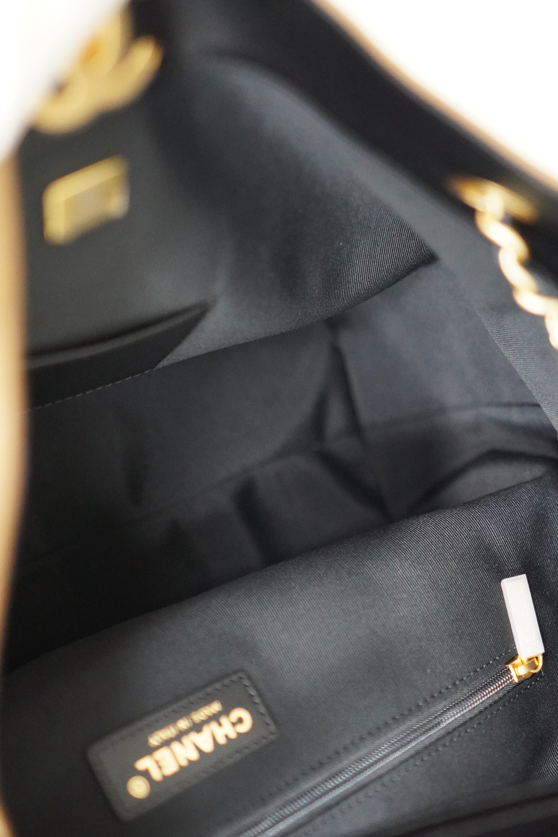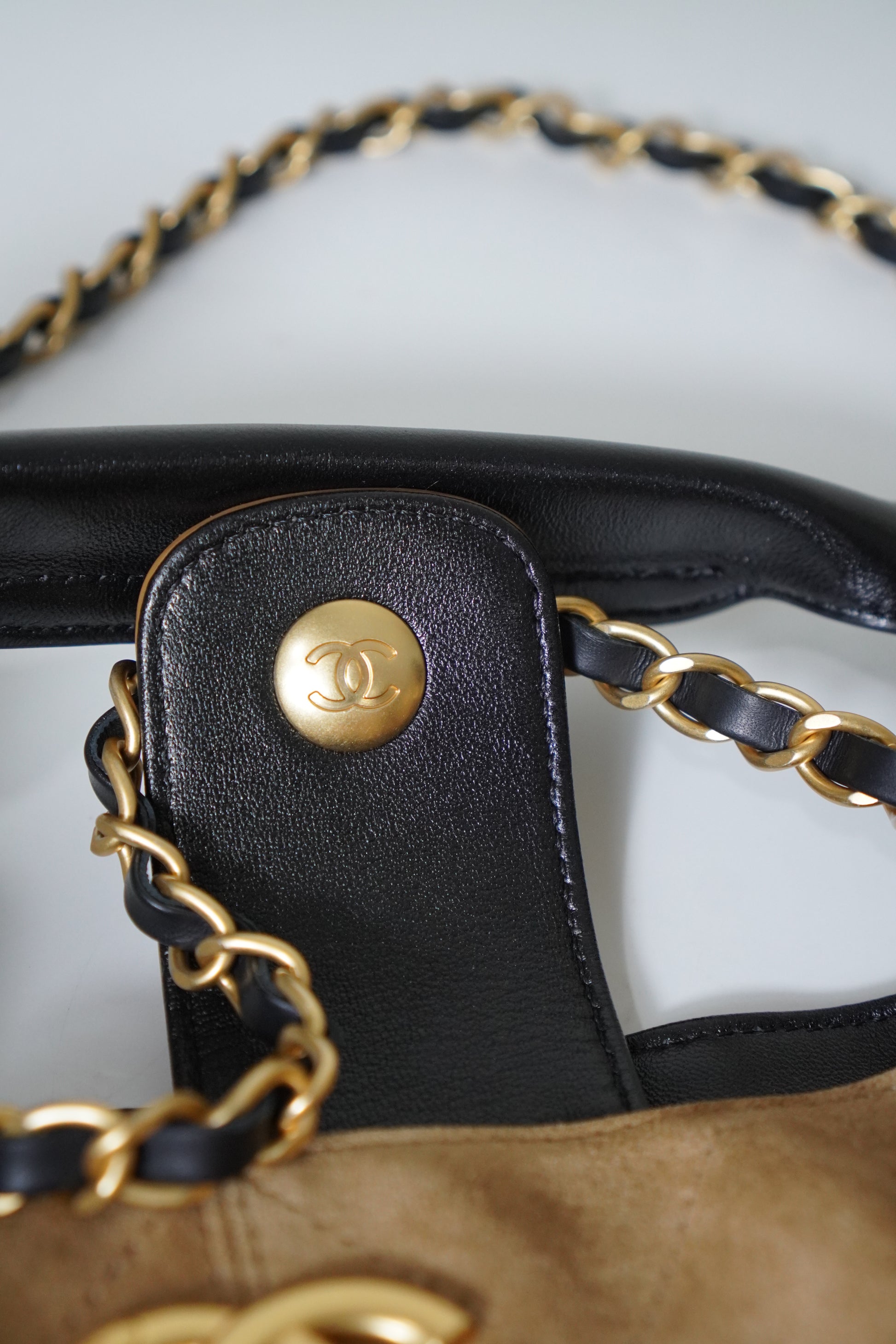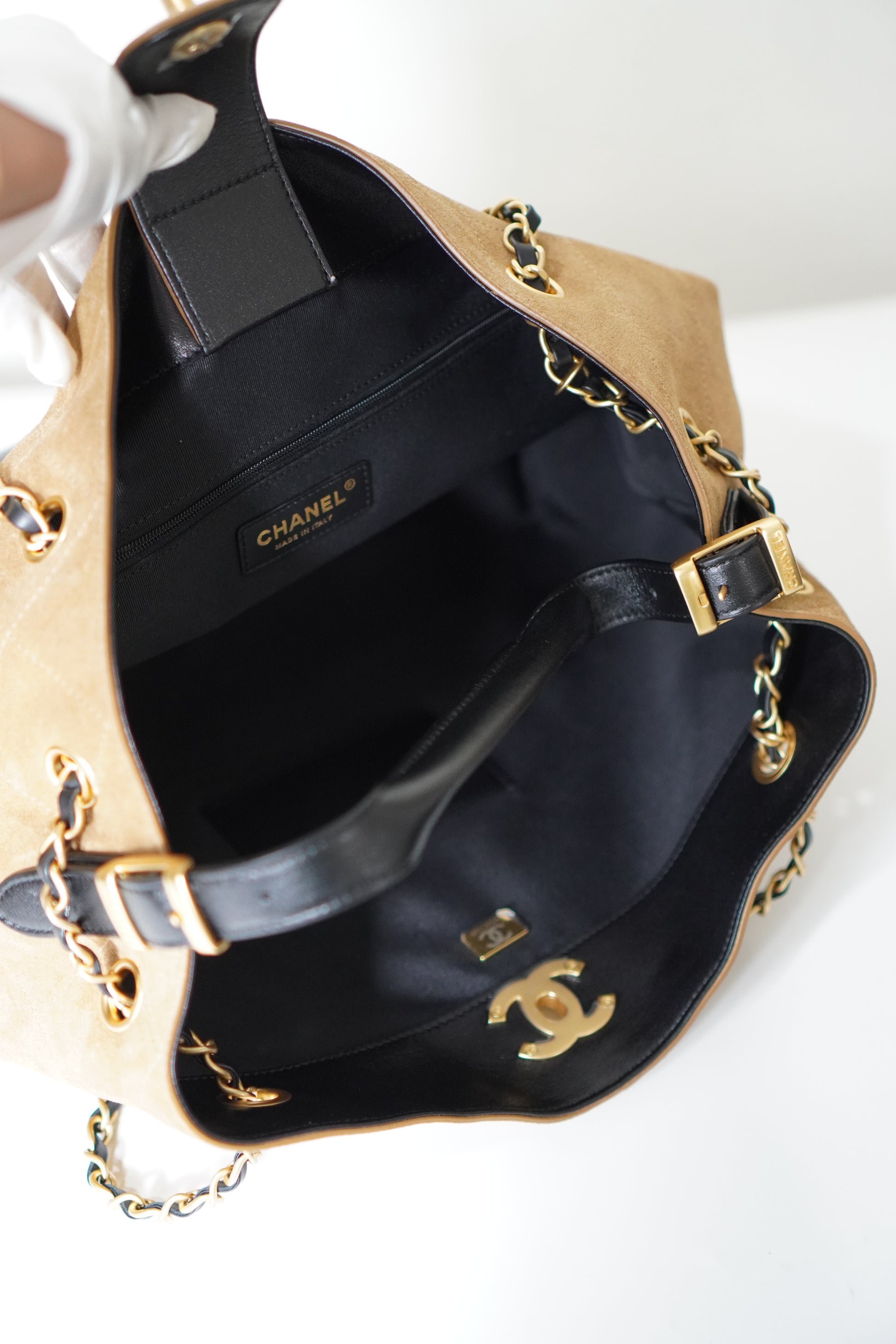 The 25A Suede Hobo brings a refined balance of texture and contrast. Crafted in supple tan suede with a structured black quilted base, it pairs relaxed ease with timeless elegance. The gold-tone chain straps interlaced with leather add a luminous finish, making it a versatile carry for both everyday wear and elevated outings.