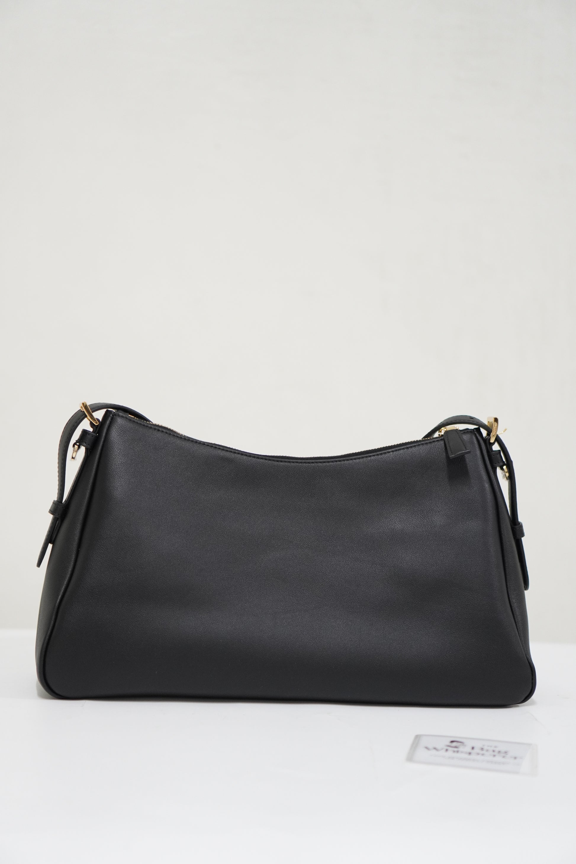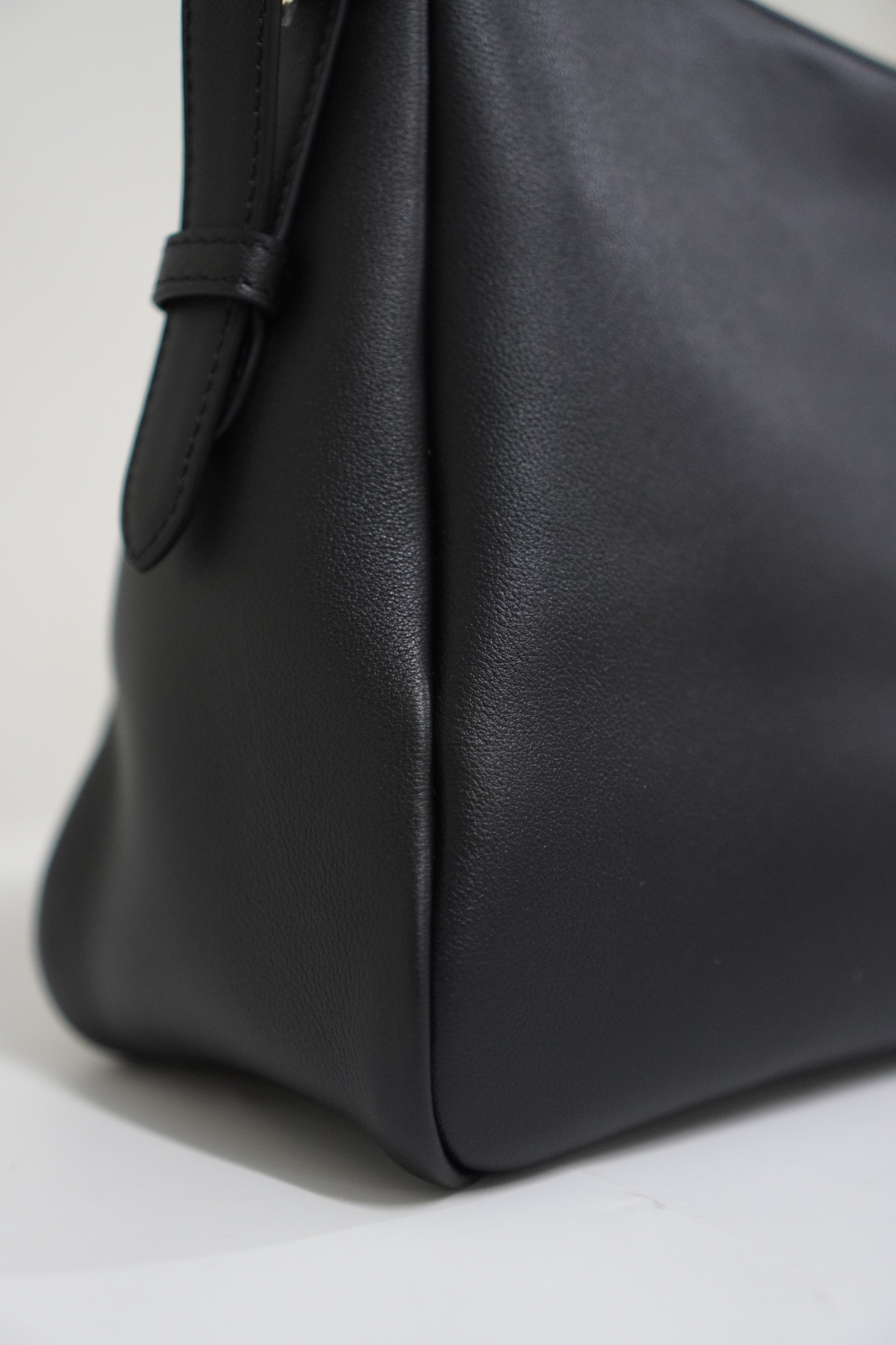 A minimalist classic inspired by '90s sophistication, the Aimée Medium Leather Shoulder Bag offers a soft, unstructured silhouette for effortlessly chic styling. Crafted in Italy from soft calf leather, this versatile piece is designed to be worn comfortably on the shoulder and combines timeless elegance with everyday practicality. The bag's design is enhanced by polished gold-tone metal hardware, including the iconic enamelled metal triangle logo on the front.