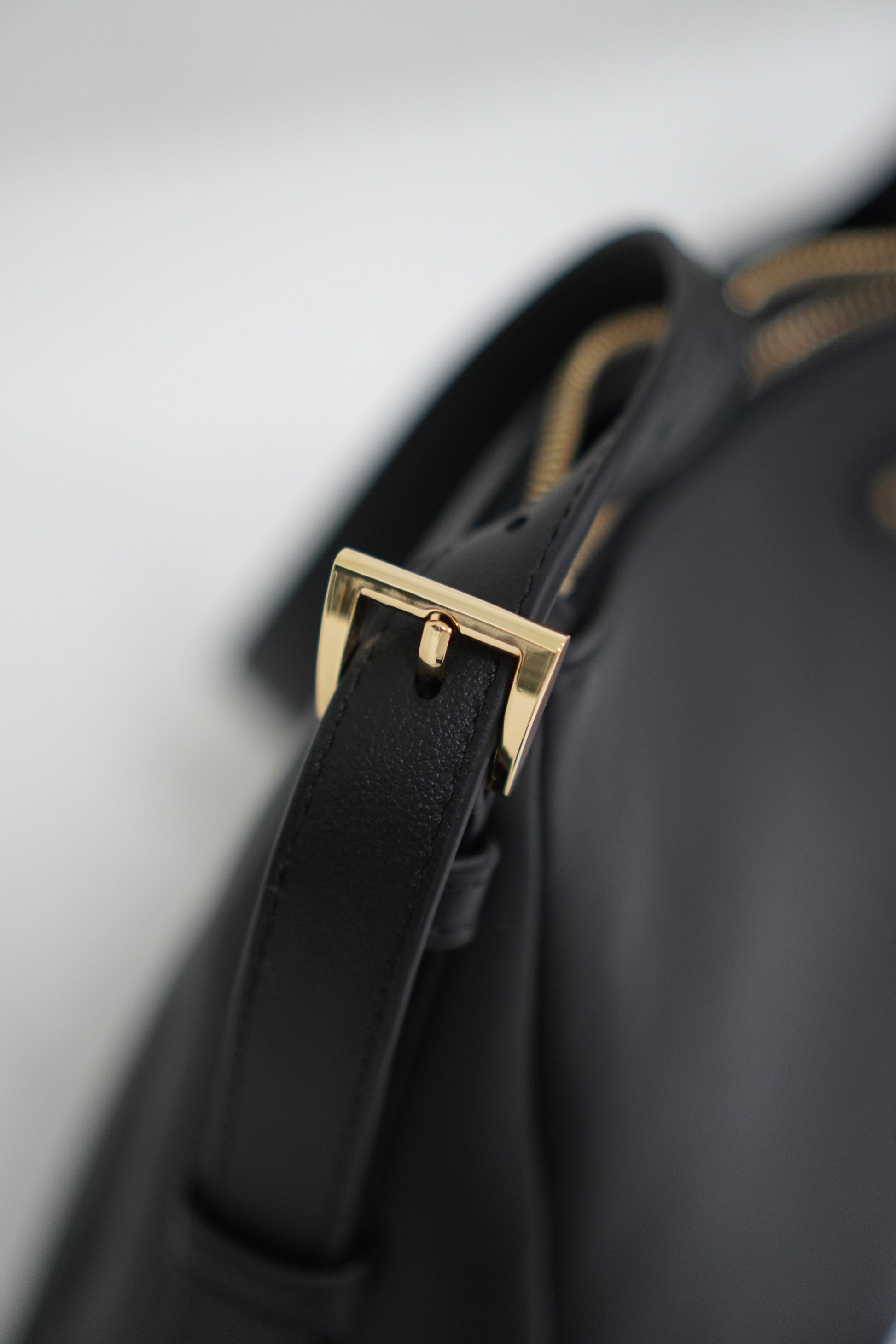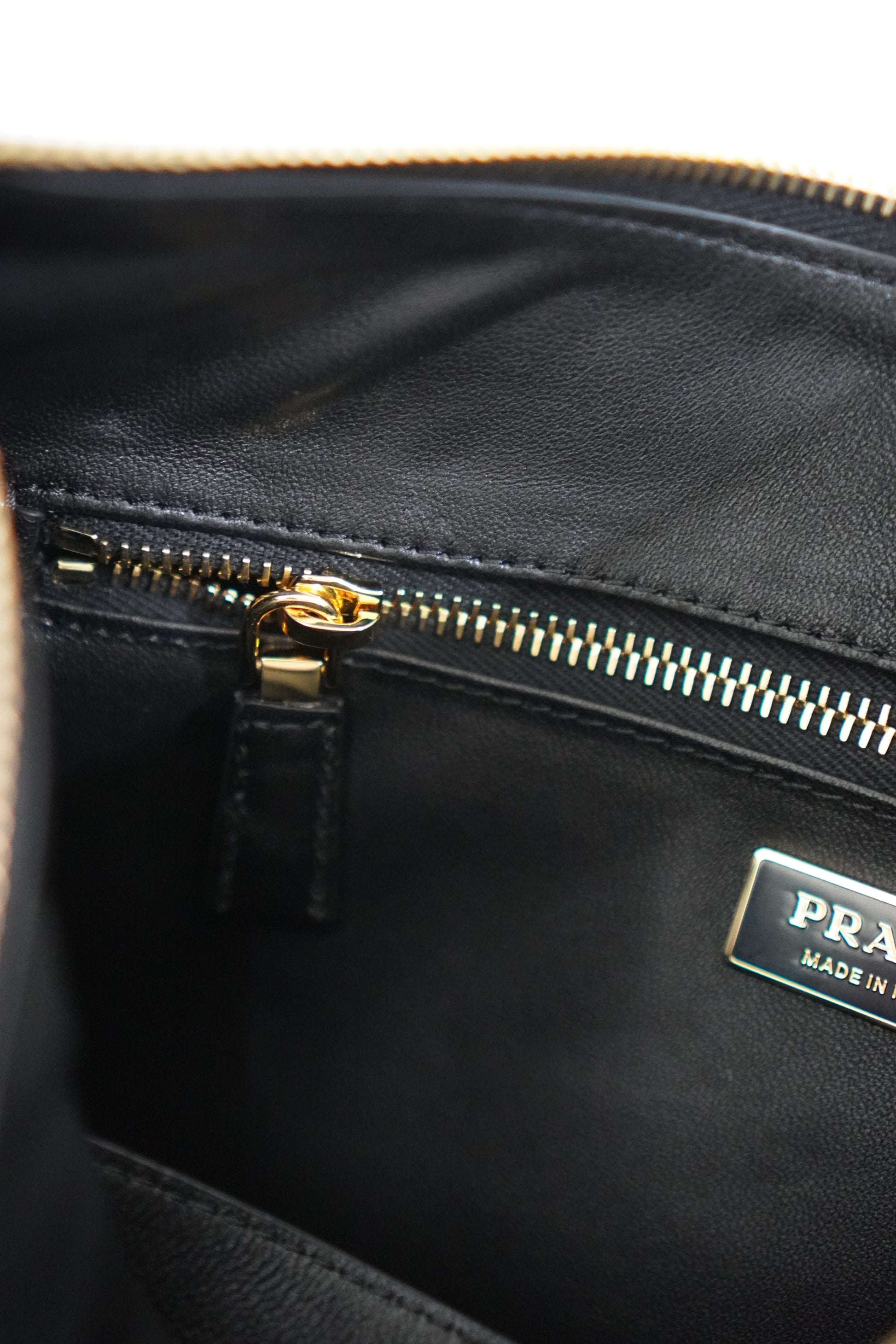- Interior: Nappa leather-lined main compartment with two pockets, including one with zipper closure