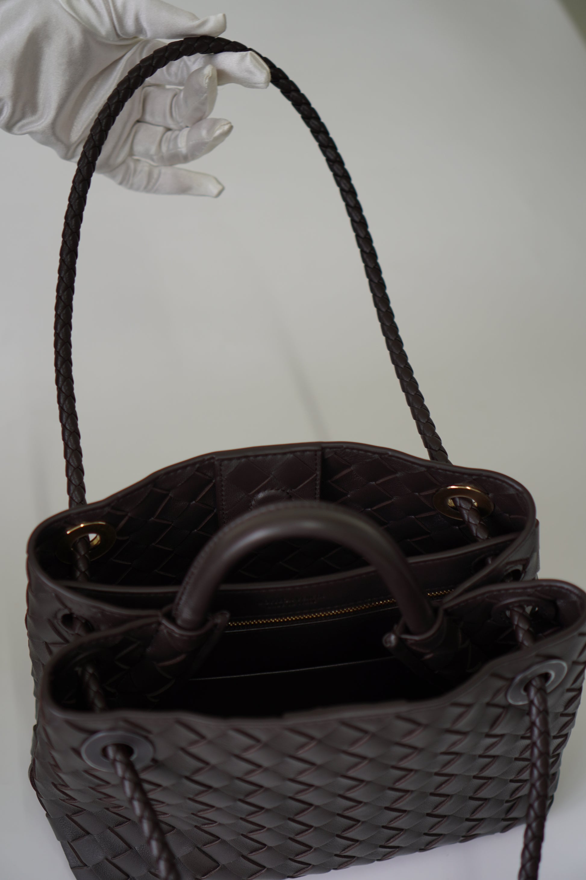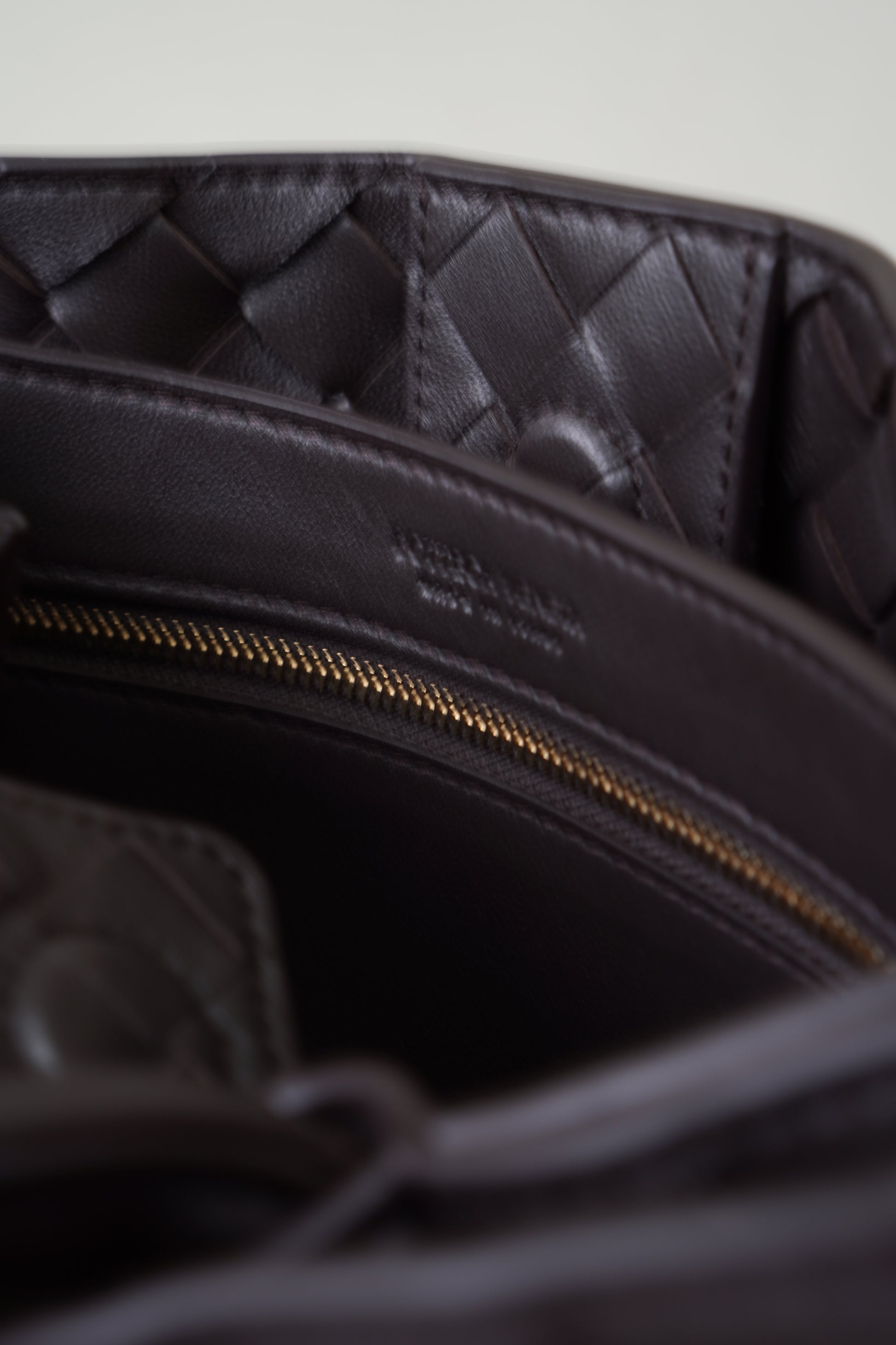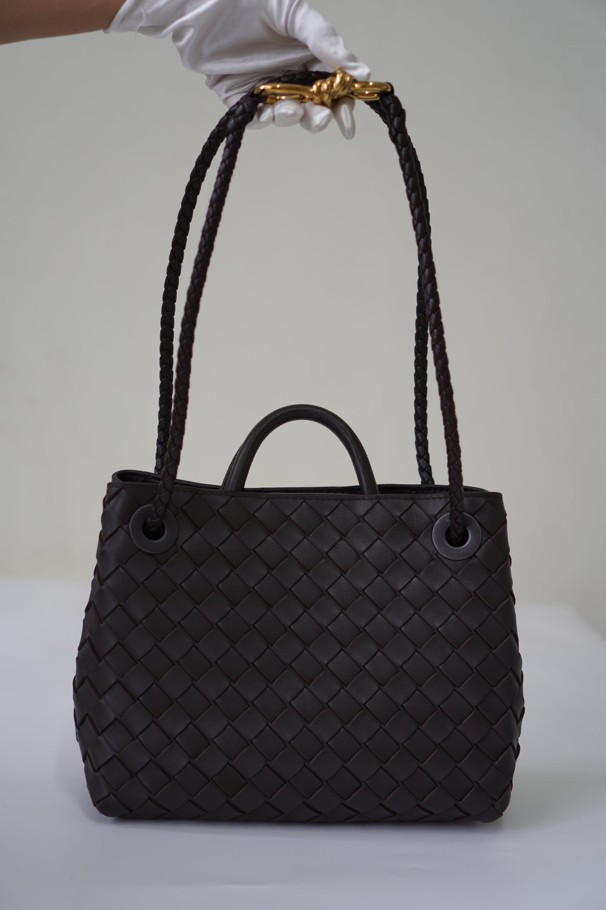 An understated design with modern elegance. This Andiamo bag in Fondant showcases a rich dark brown hue, crafted in soft lambskin with the signature woven intrecciato finish. Its structured silhouette and versatile style make it the perfect companion for both casual and refined looks, blending timeless craftsmanship with contemporary appeal.