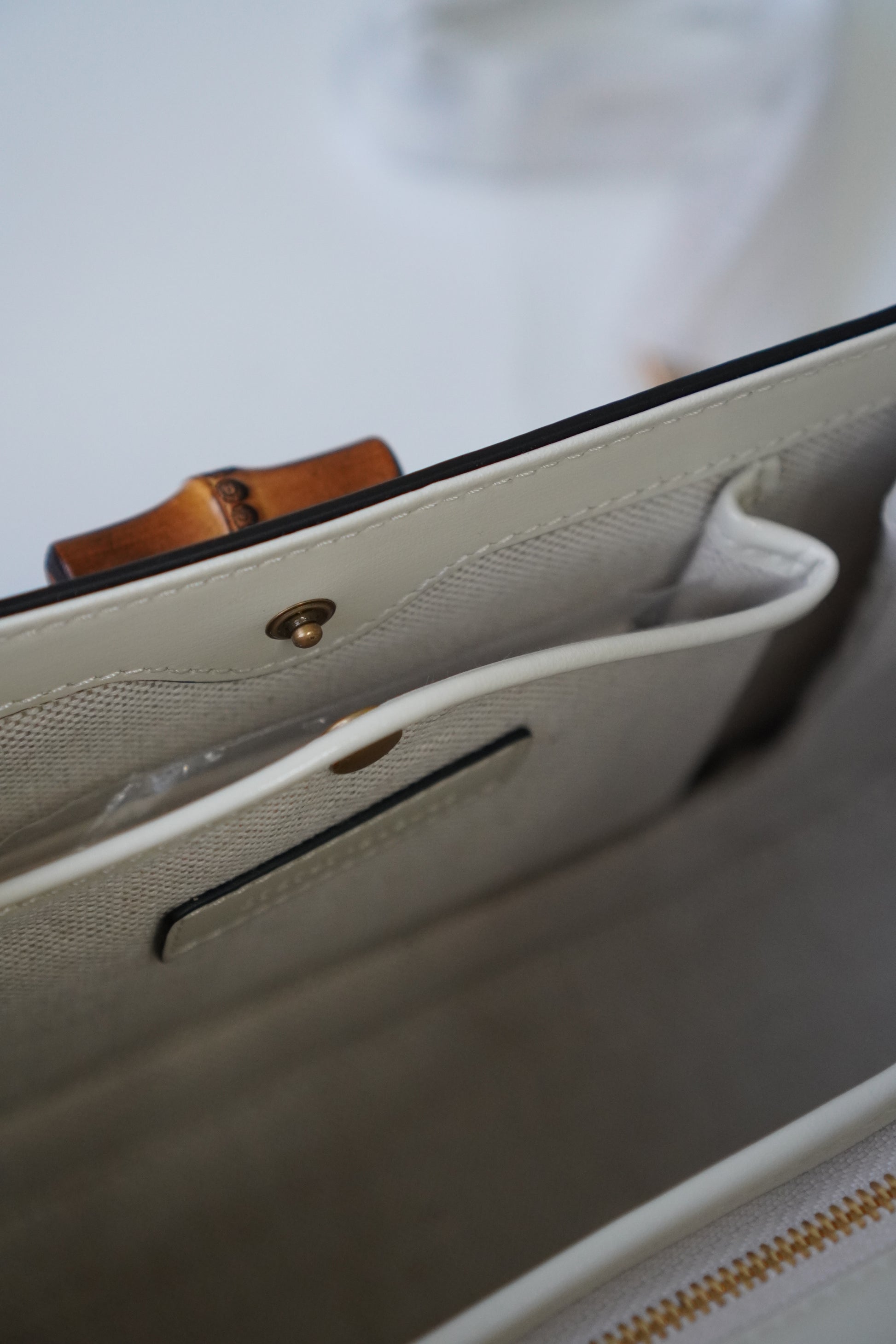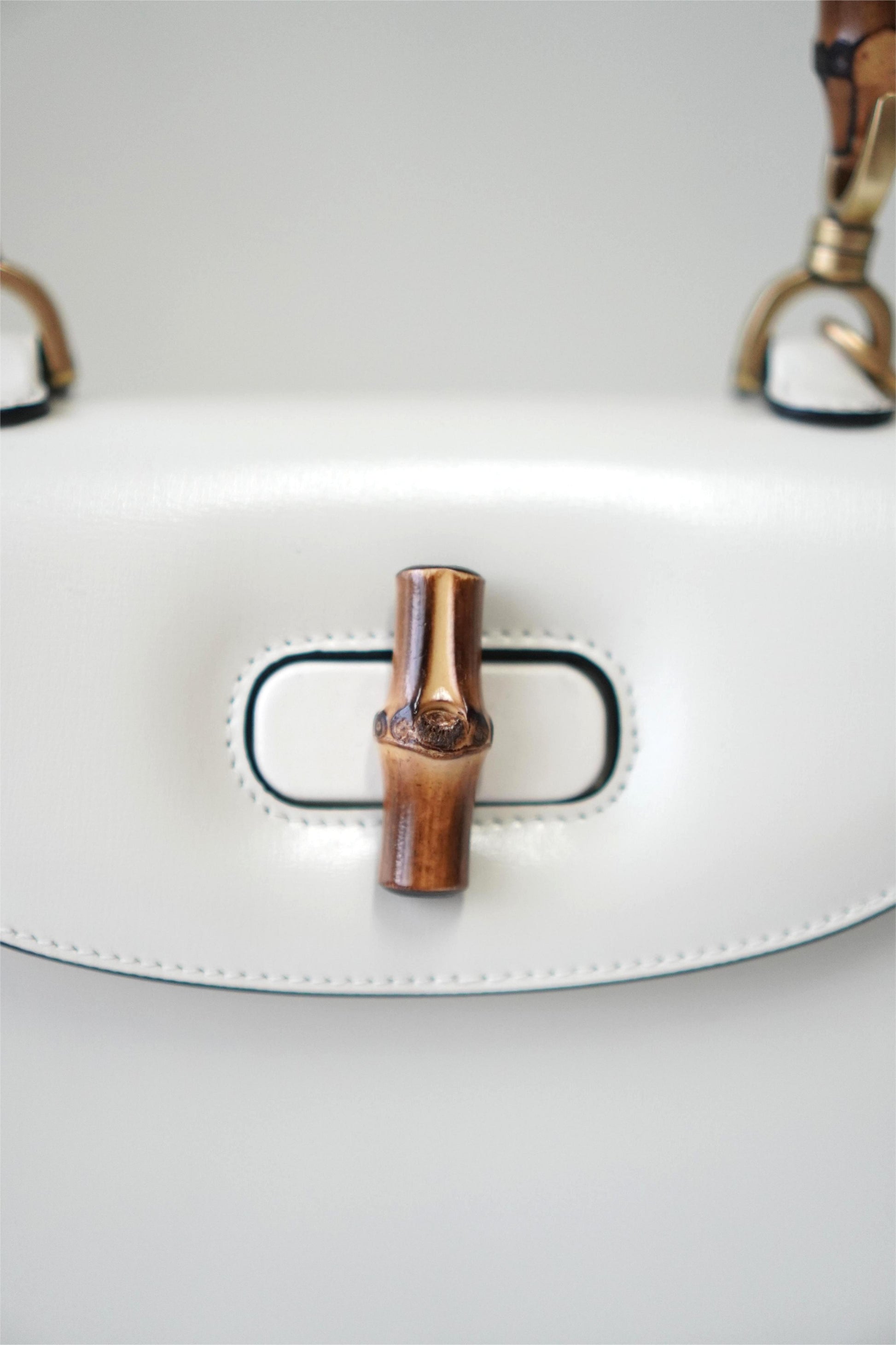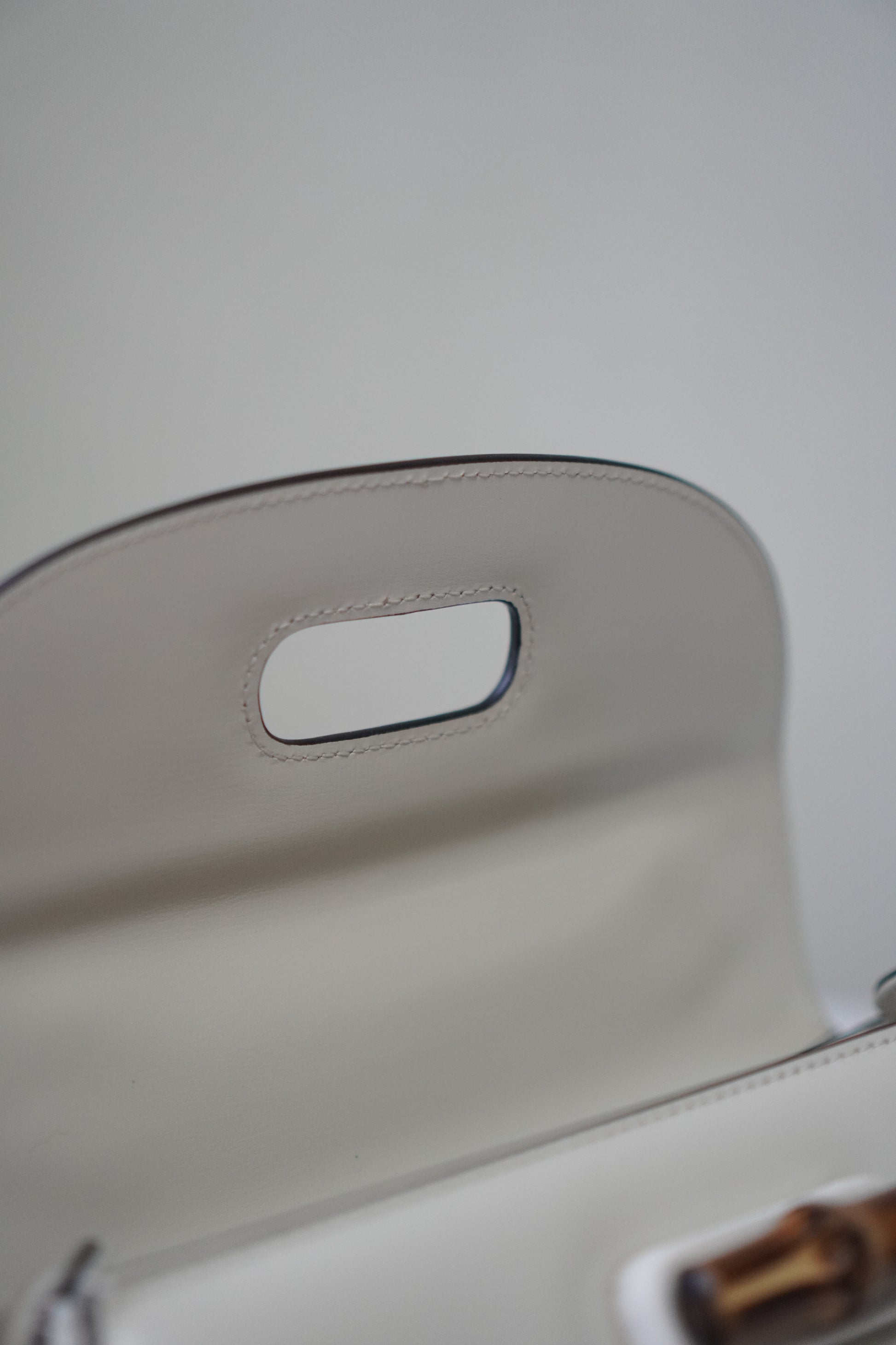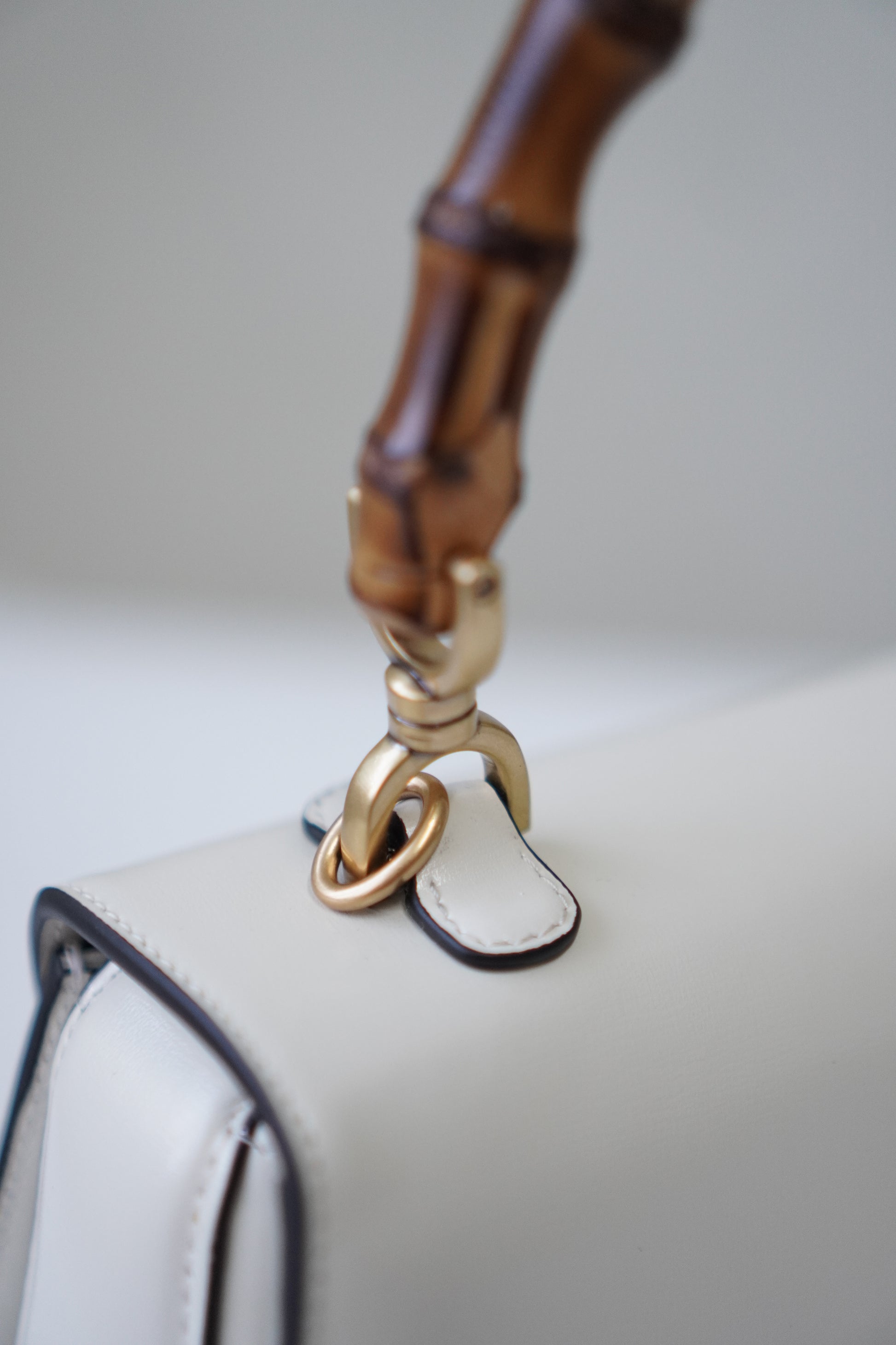 A sophisticated and iconic top-handle bag that perfectly blends heritage craftsmanship with modern femininity. Crafted from smooth white leather, this elegant piece is defined by its distinctive bamboo handle and turn-lock closure — a timeless detail that adds character and charm. Compact yet structured, it transitions seamlessly from daywear to elegant evenings.