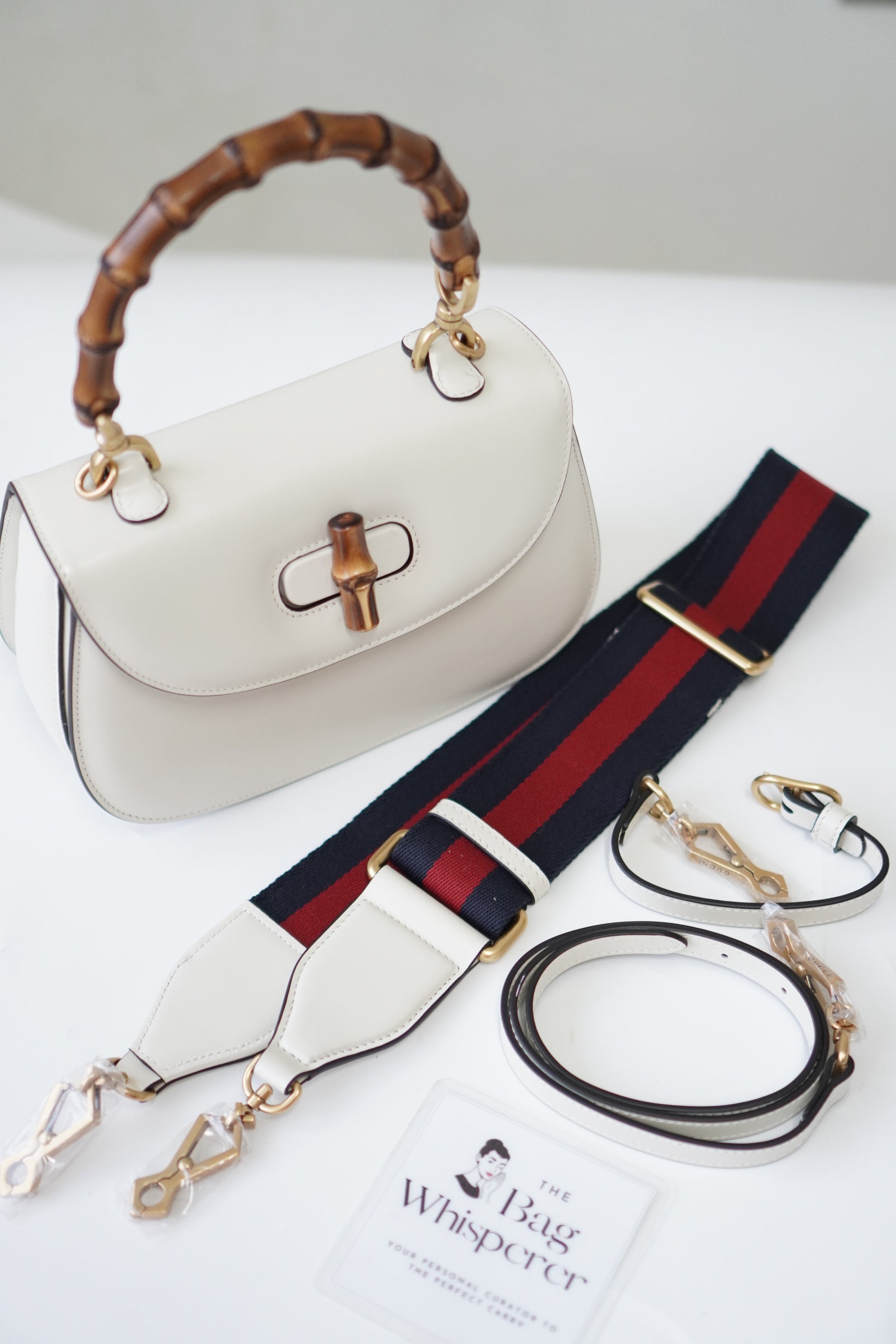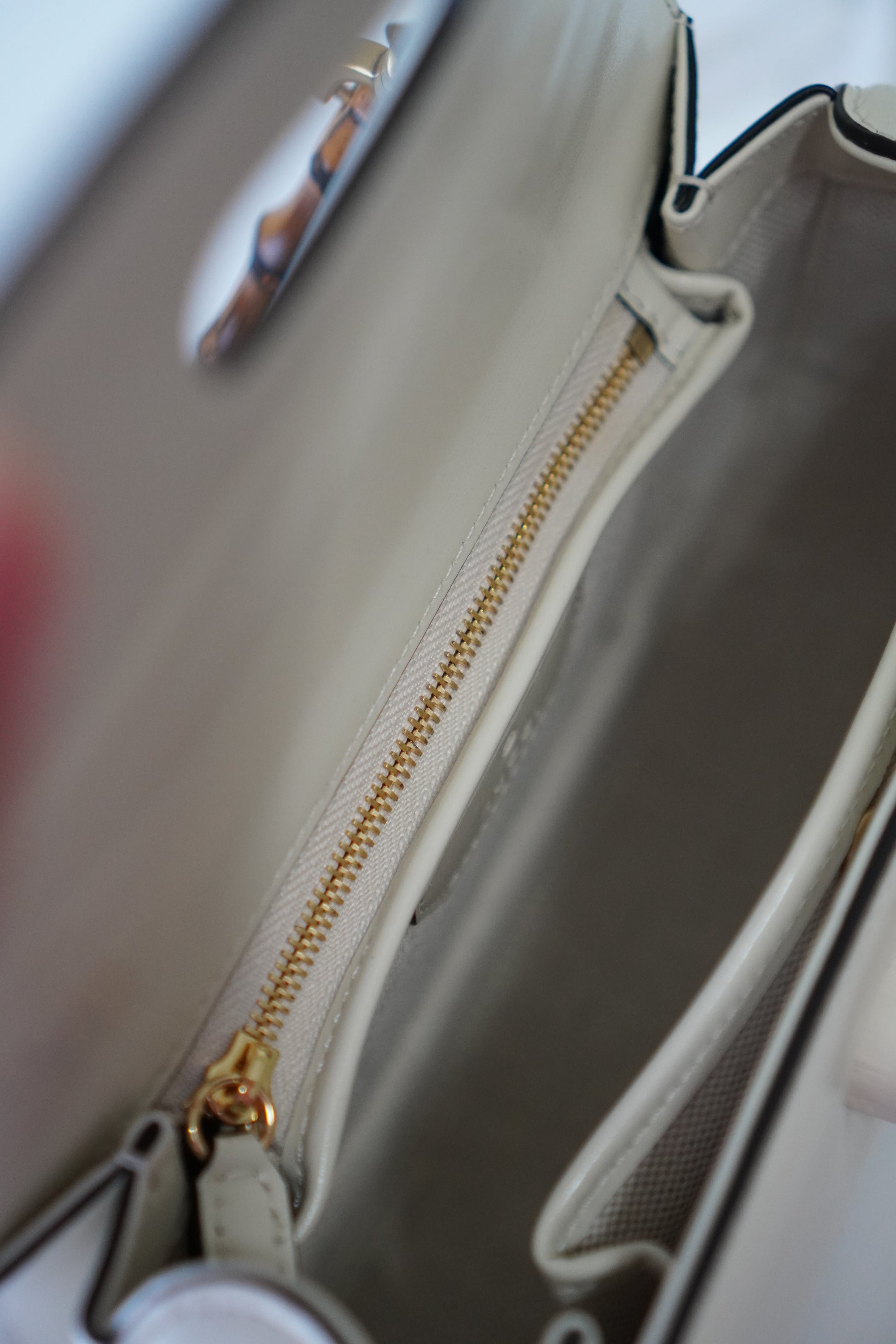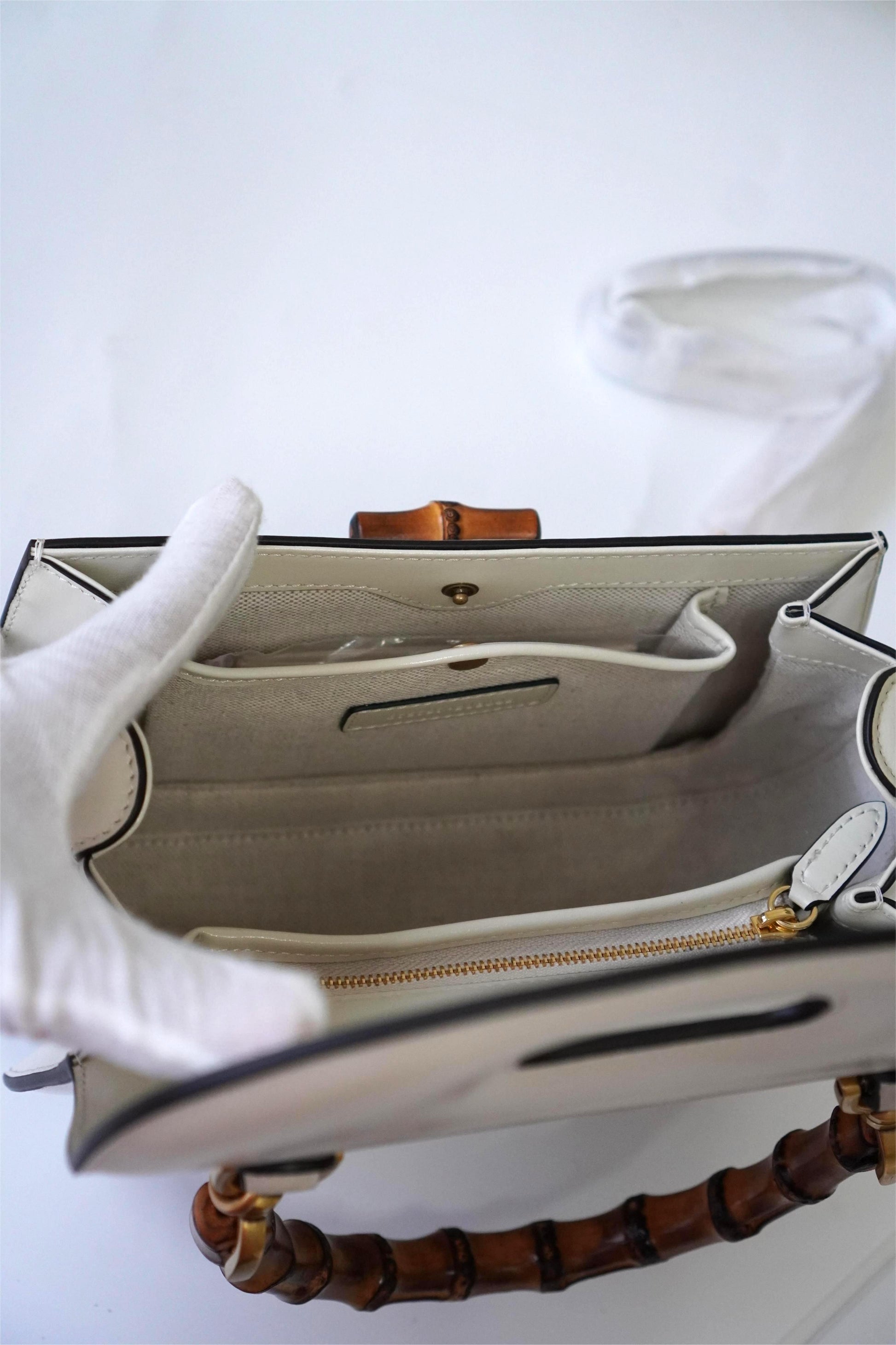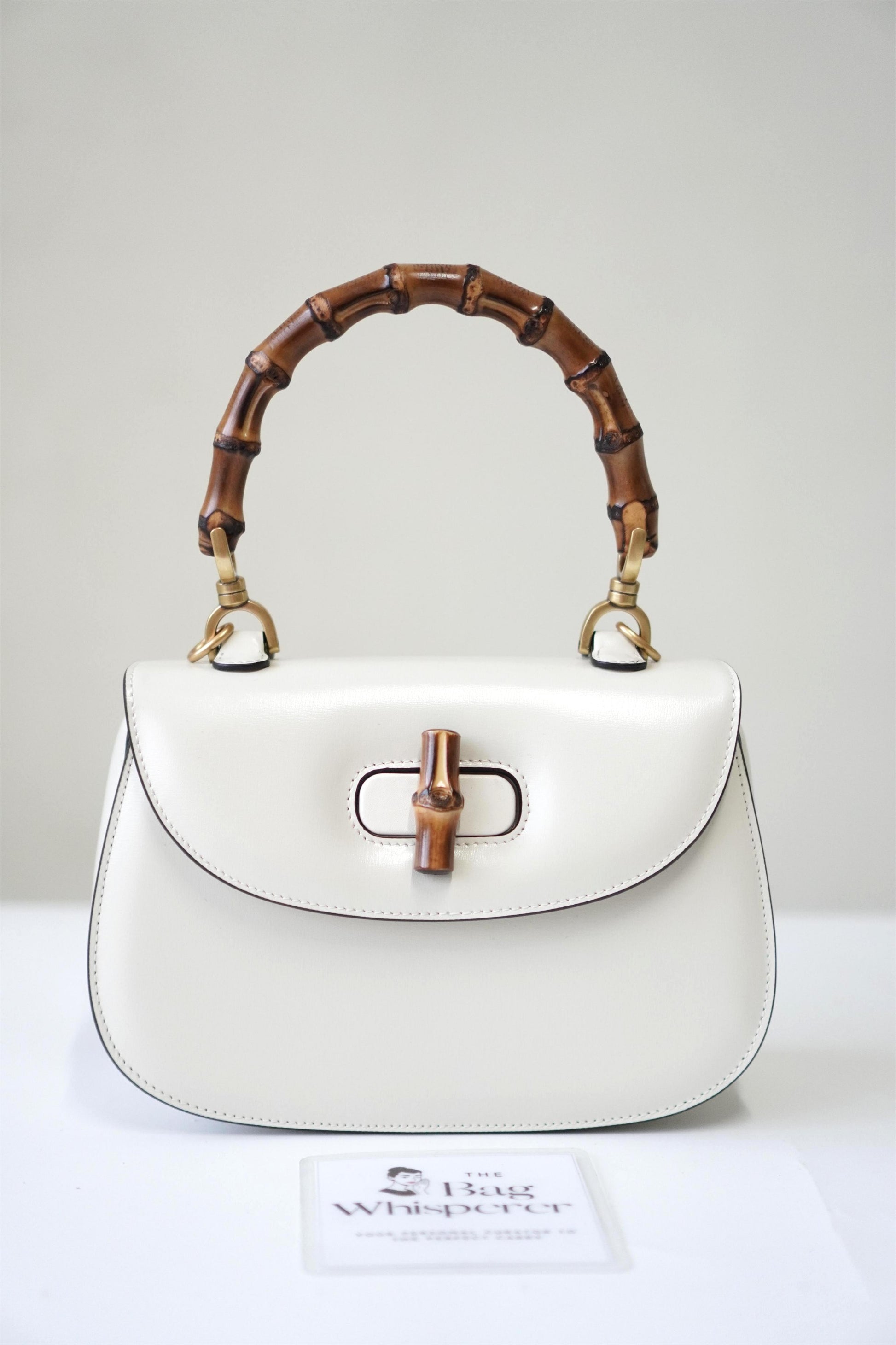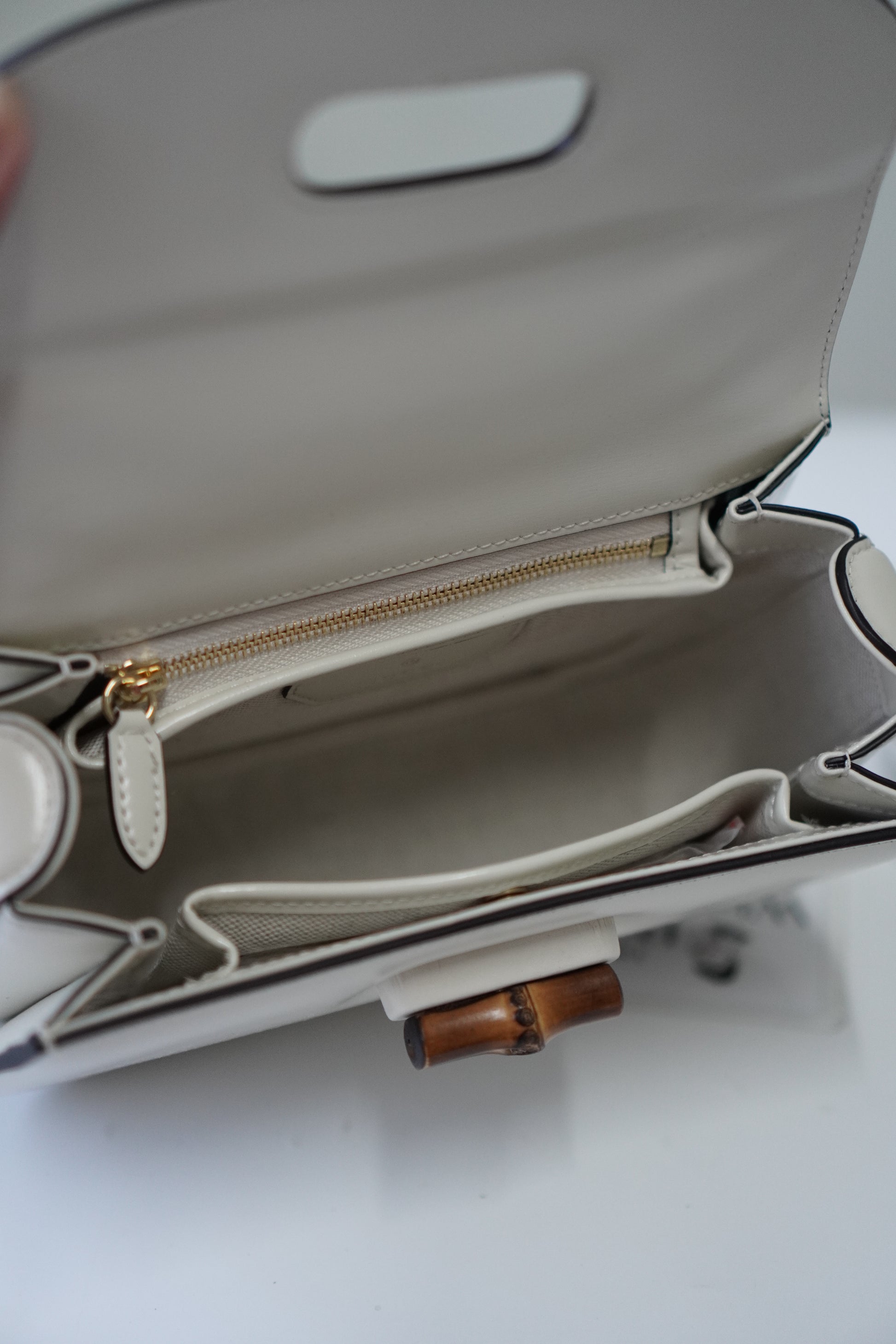 A sophisticated and iconic top-handle bag that perfectly blends heritage craftsmanship with modern femininity. Crafted from smooth white leather, this elegant piece is defined by its distinctive bamboo handle and turn-lock closure — a timeless detail that adds character and charm. Compact yet structured, it transitions seamlessly from daywear to elegant evenings.