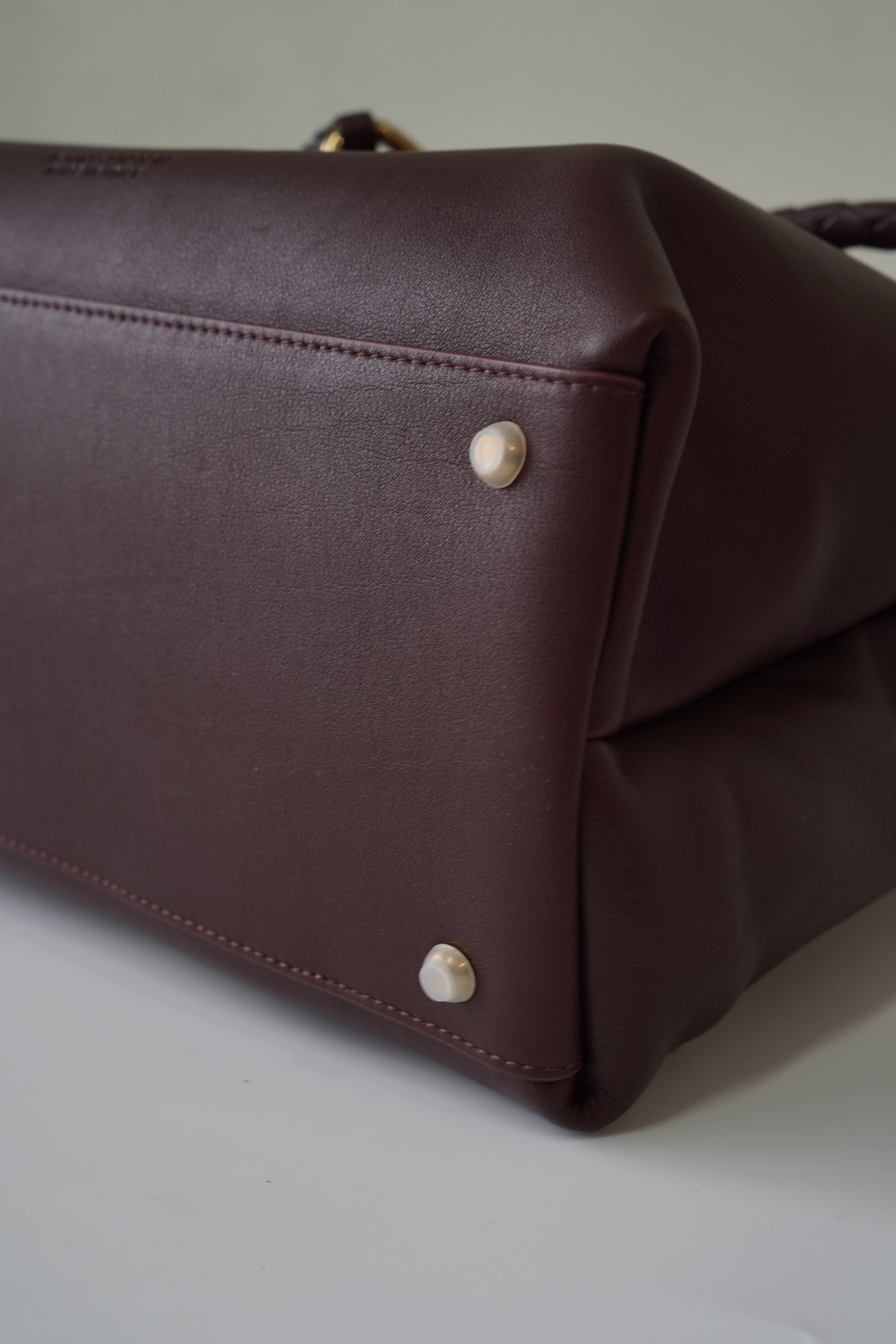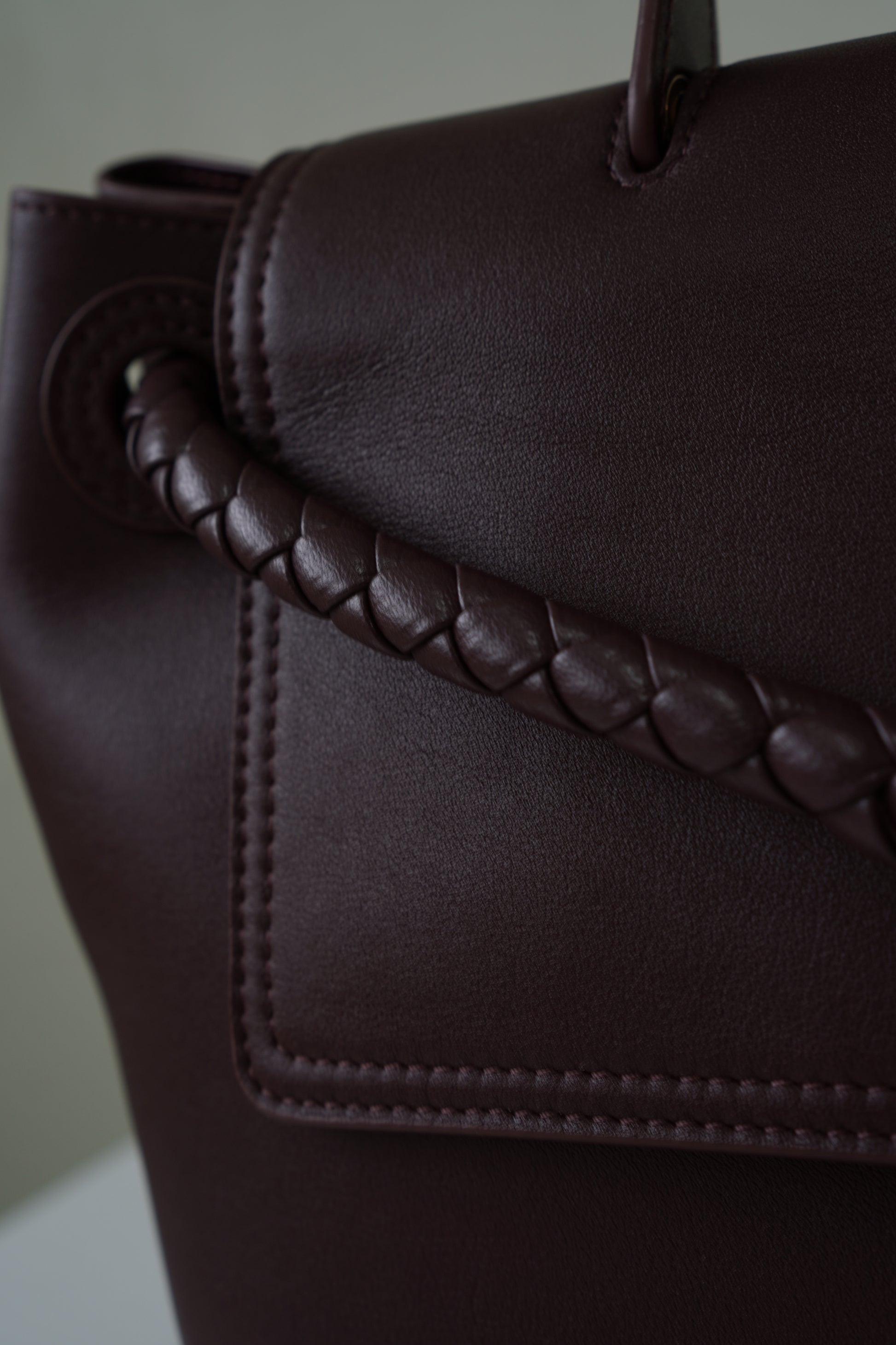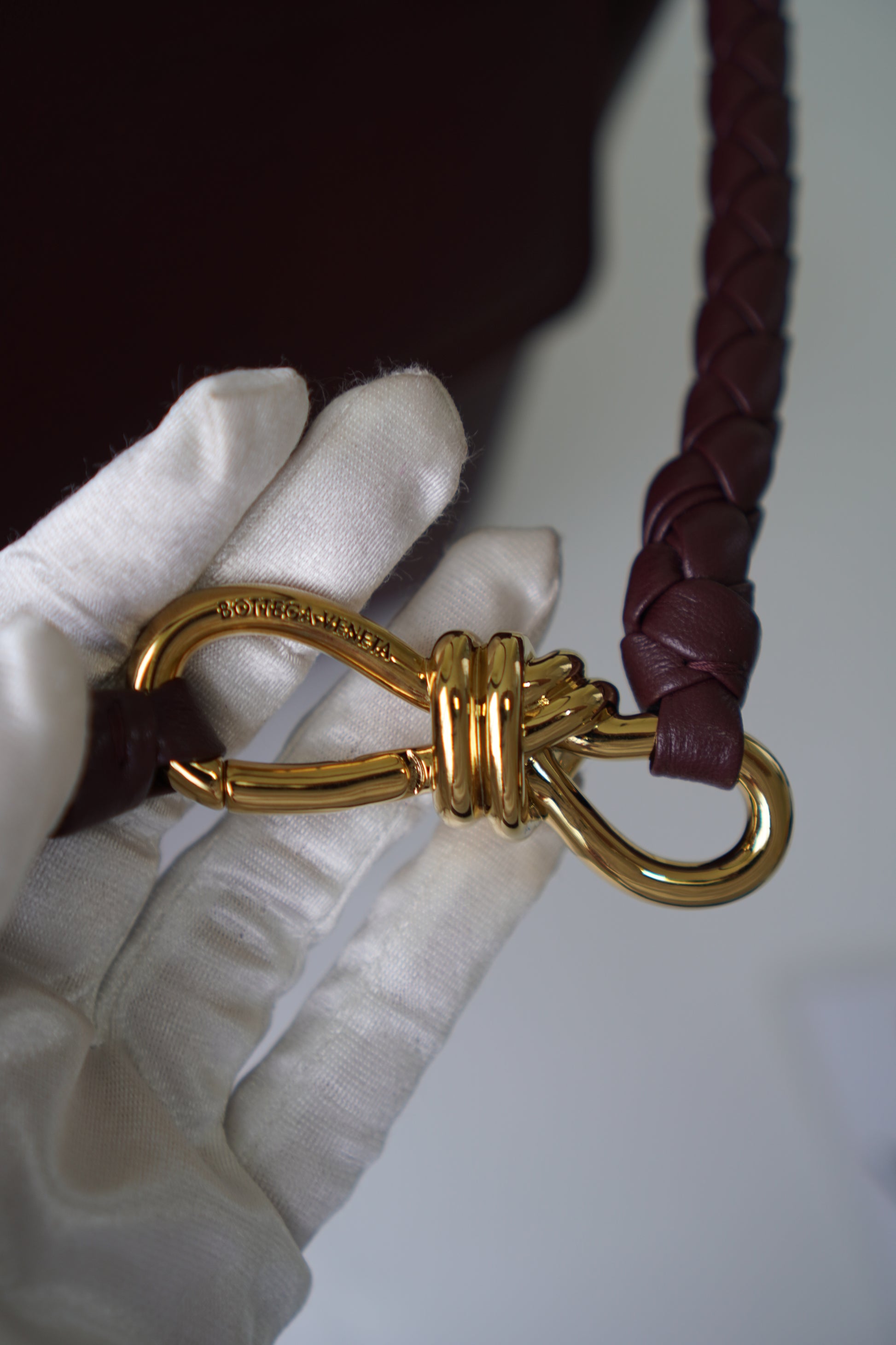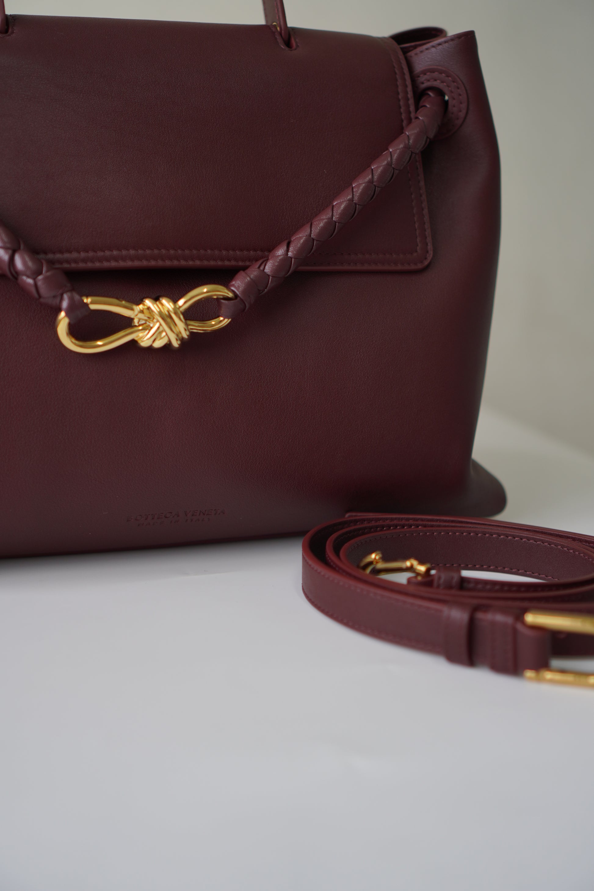 A sophisticated carryall with modern elegance. This Ciao Ciao Medium in burgundy smooth leather is detailed with a braided strap threaded through bold grommets, finished with a signature gold-tone knot clasp. Designed with both a top handle and detachable shoulder strap, its spacious yet refined silhouette makes it ideal for daily use while maintaining a sleek, polished look.
