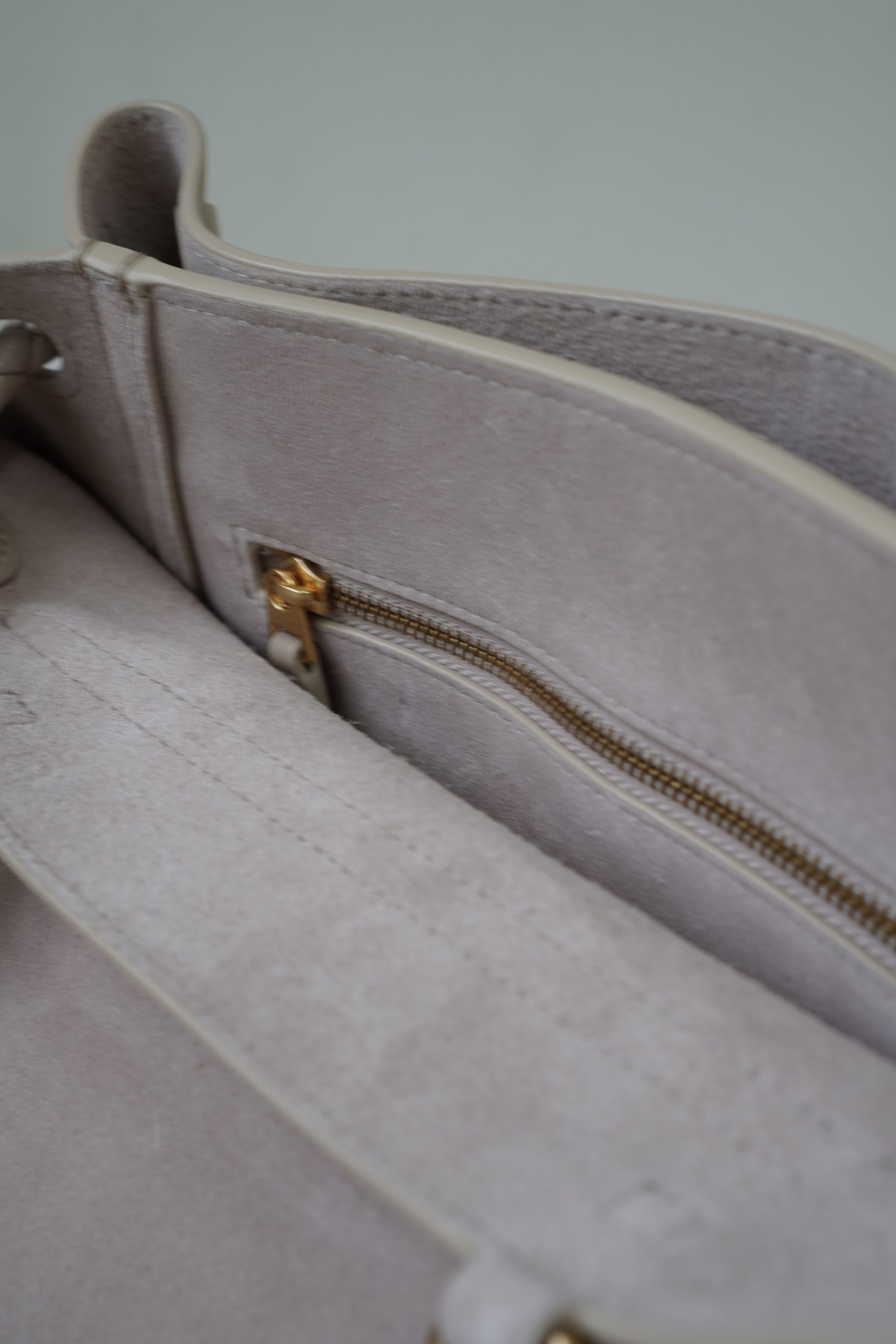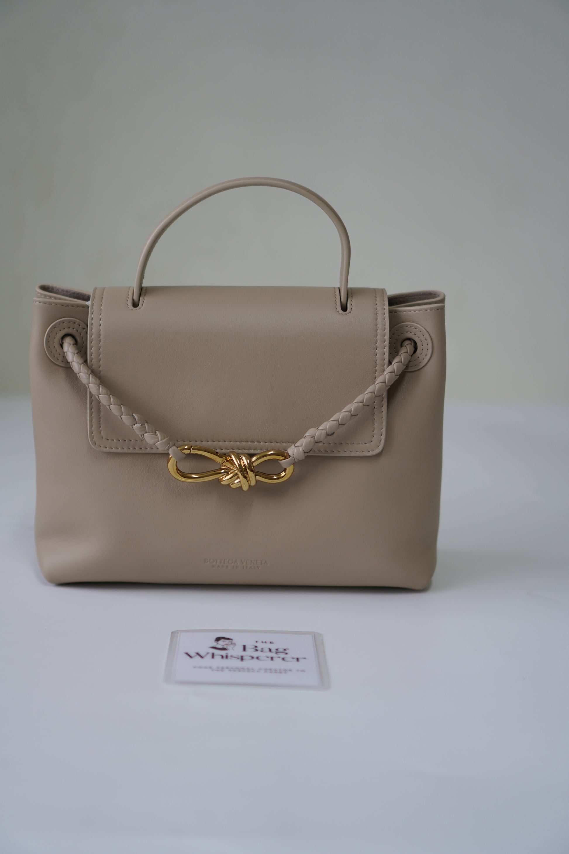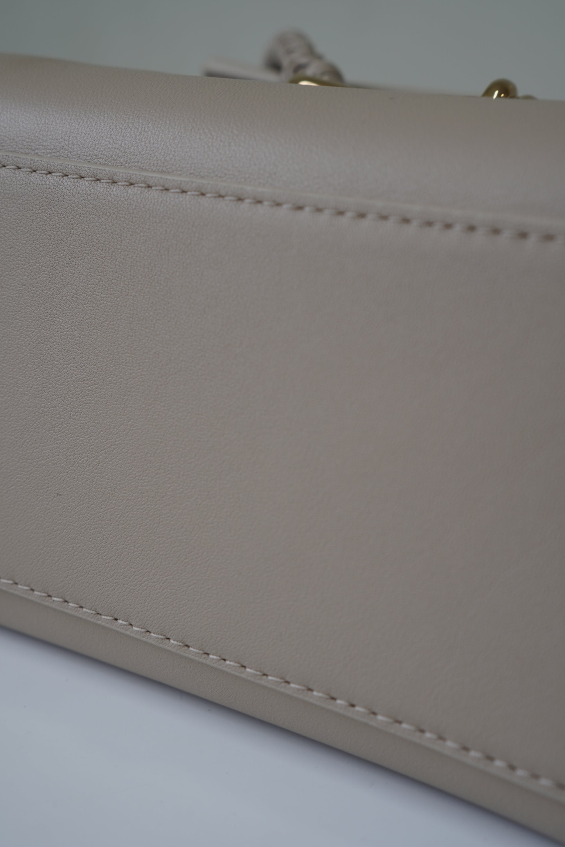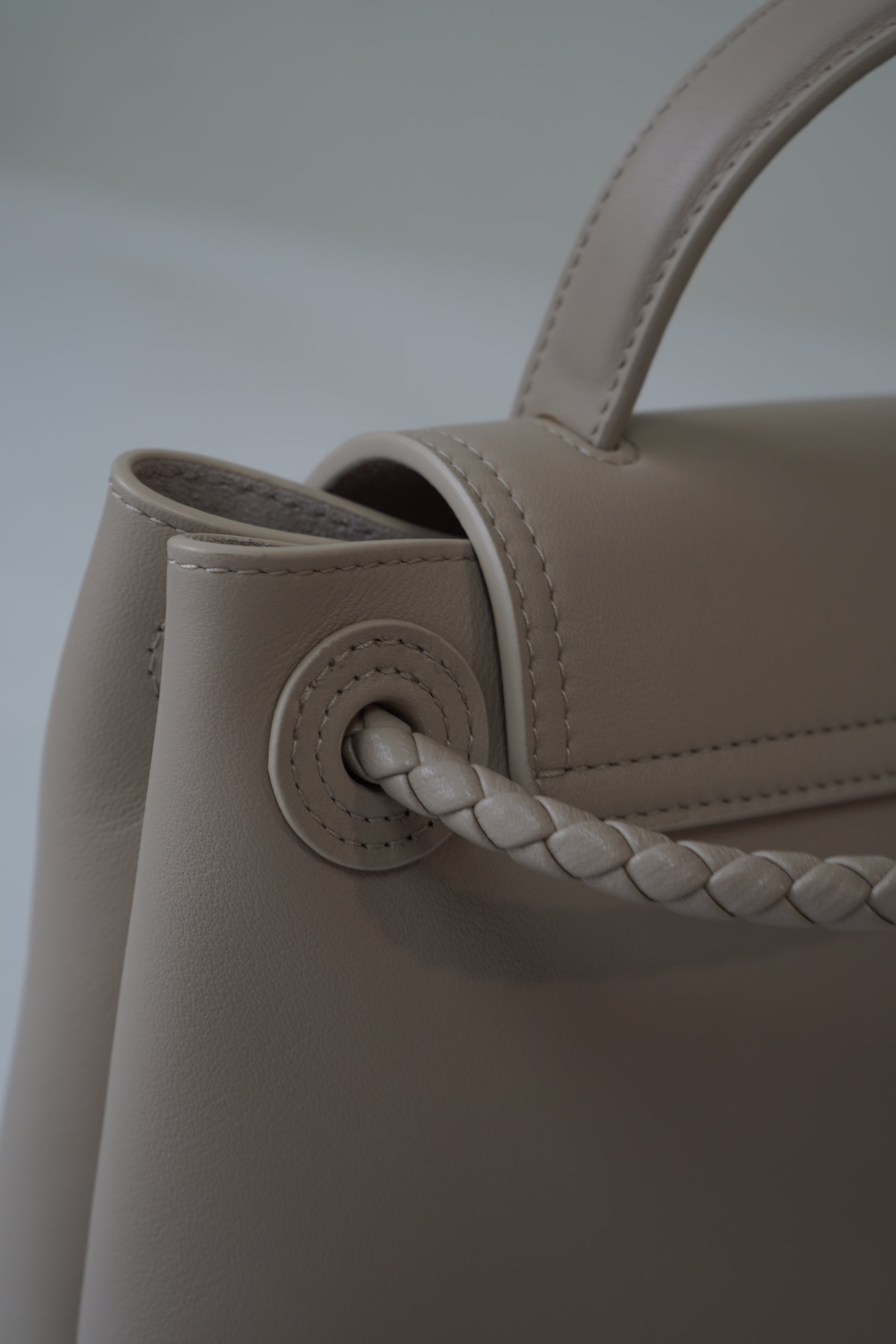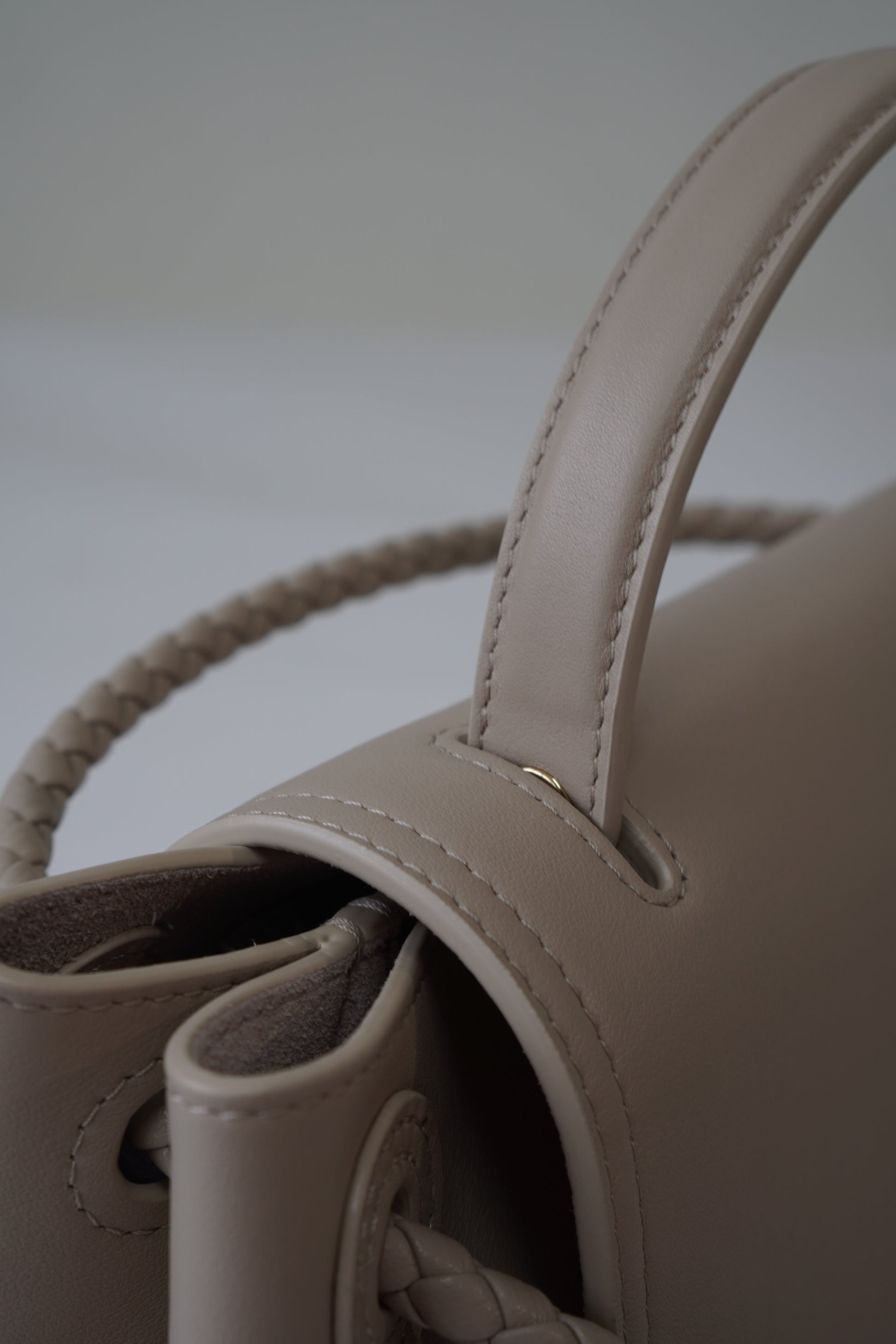 A chic and versatile piece with modern details. This Ciao Ciao Small in beige smooth leather is accented with a braided handle threaded through bold grommets and finished with a statement knot clasp in gold-tone hardware. Compact yet practical, its structured silhouette and neutral shade make it an elegant option for both everyday wear and polished occasions.