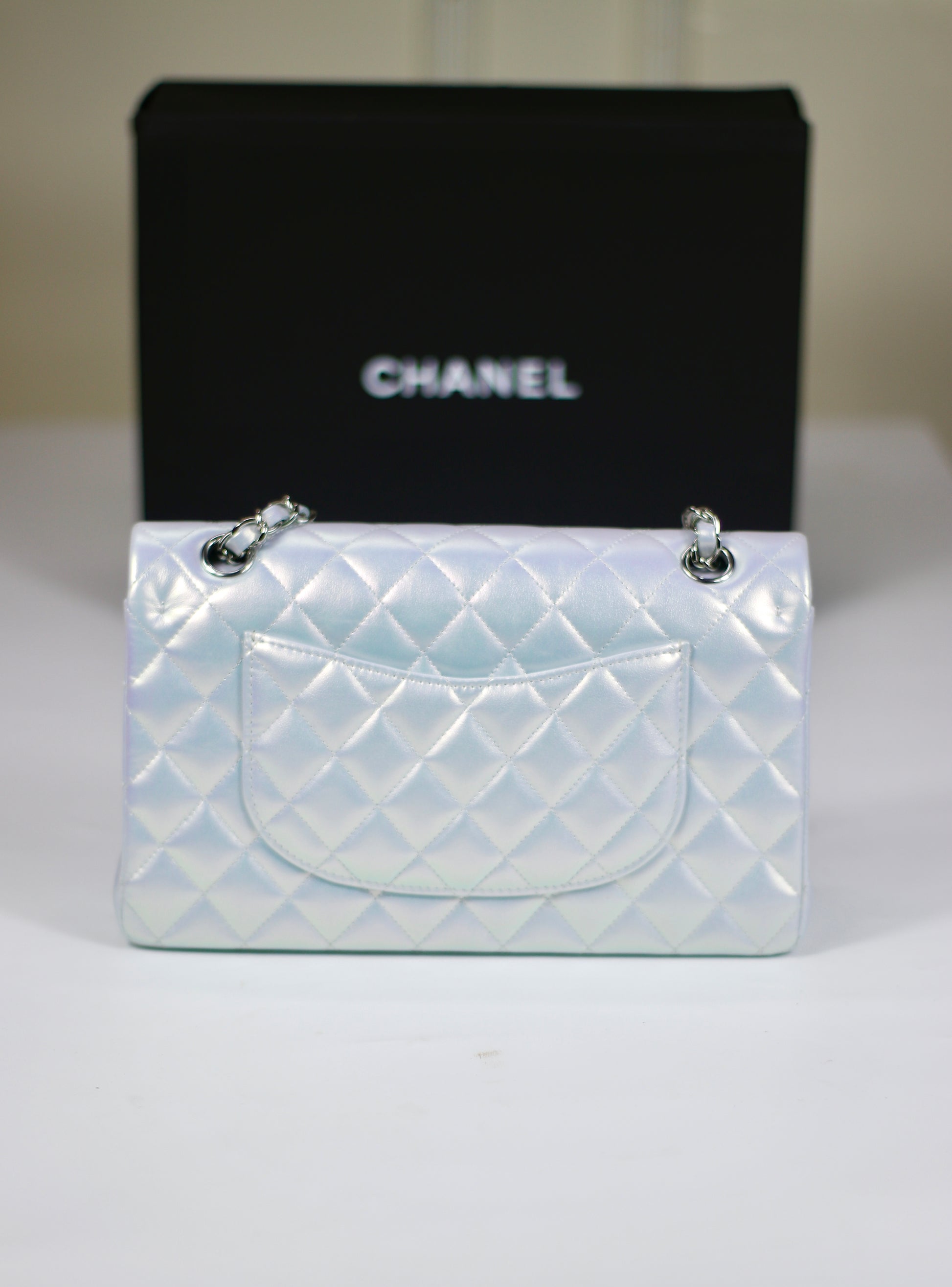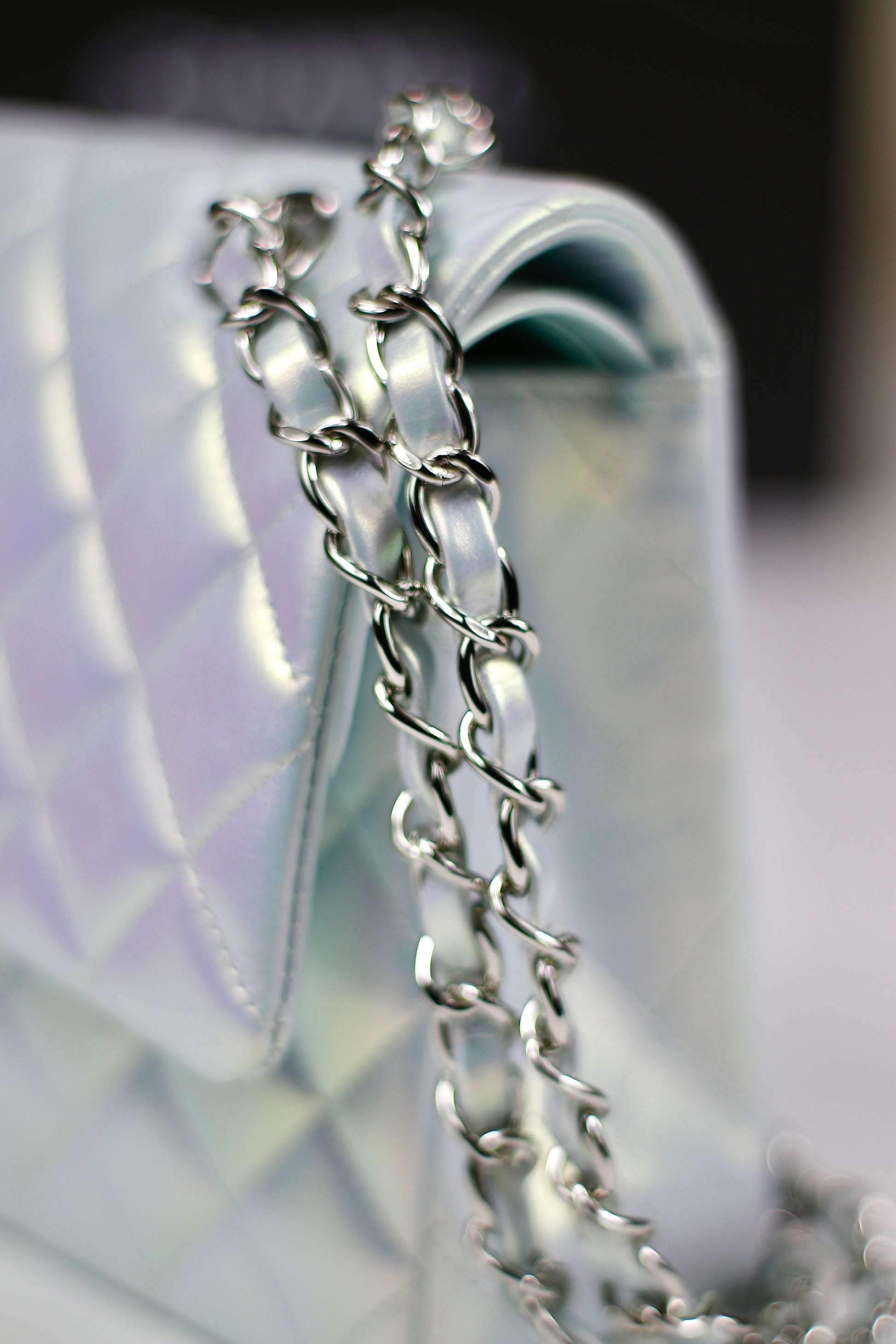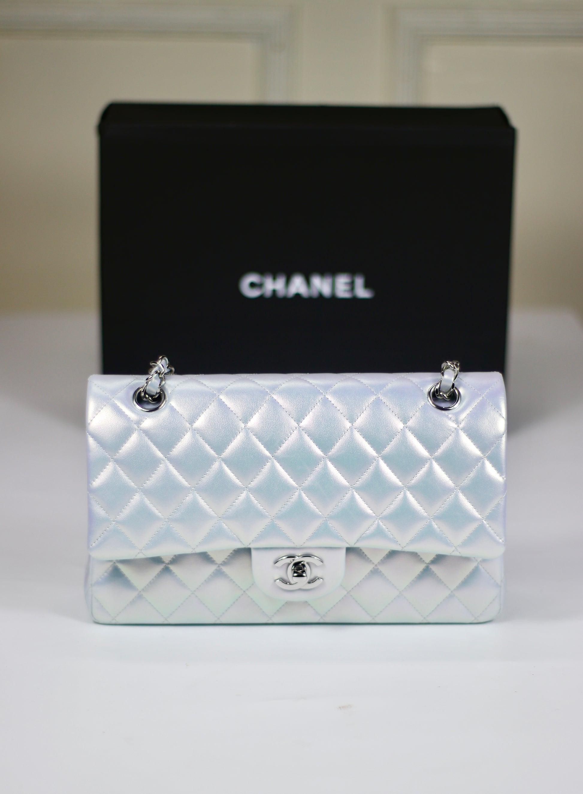 A dream in shimmer and light. This Classic Flap from the 21K collection features a mesmerizing iridescent blue finish that shifts beautifully with every angle—reminiscent of moonlight on water. Crafted in signature quilted leather and finished with silver-tone hardware, this piece is both playful and timeless.