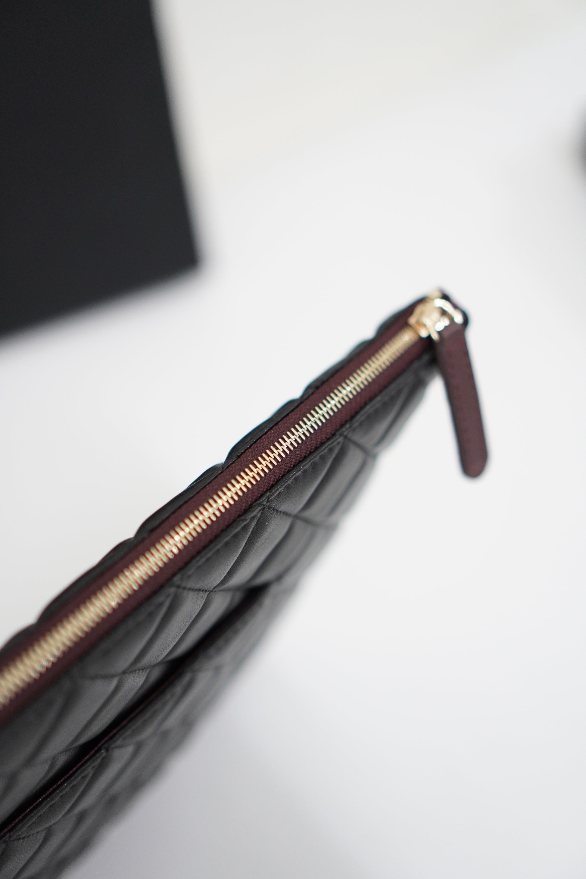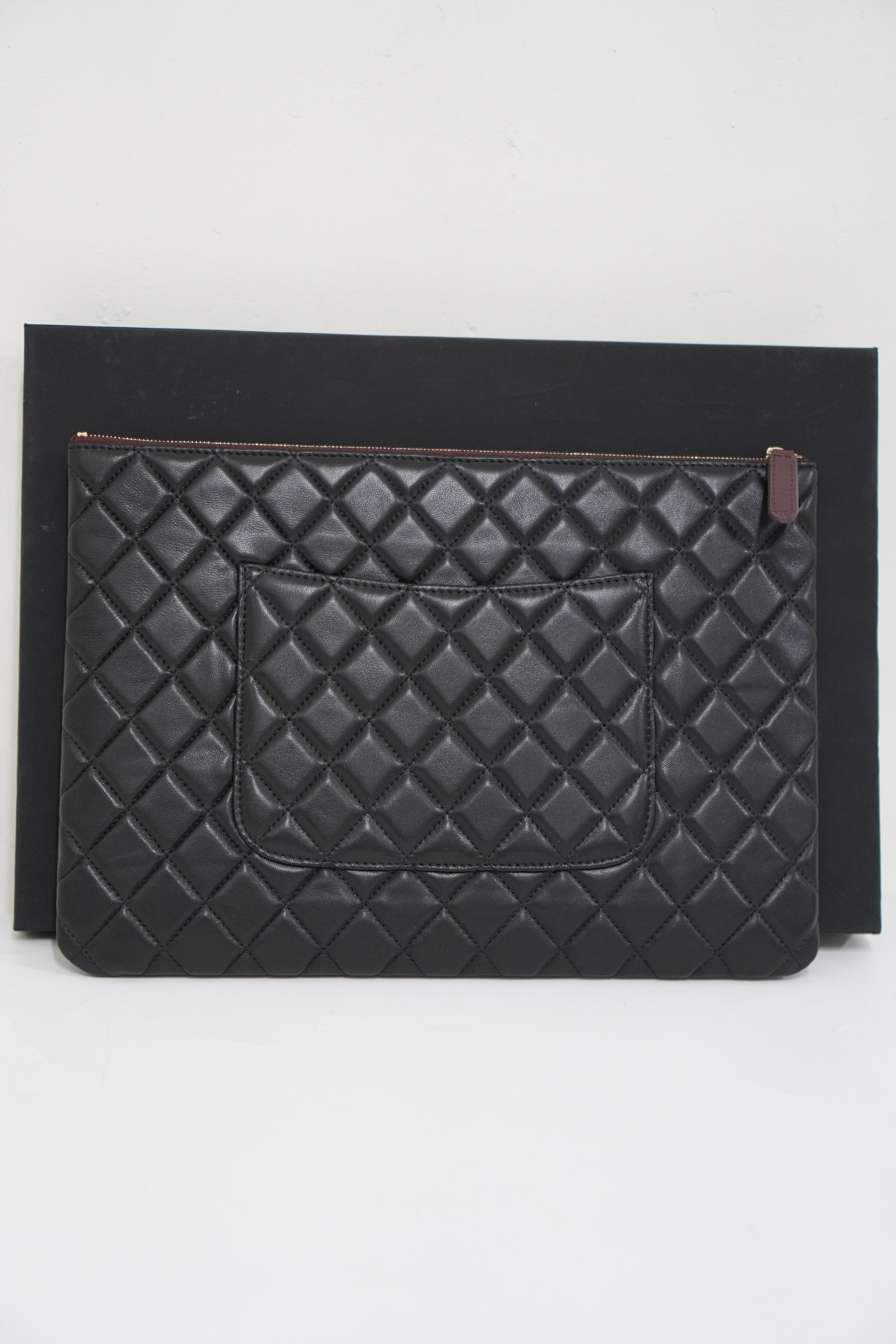 A sleek and timeless piece, this Classic Quilted Lambskin Clutch with Gold-tone Hardware features luxurious diamond-quilted lambskin and a slim, elegant silhouette perfect for both day and evening use. The soft leather, refined stitching, and polished gold zipper pull give it a sophisticated finish that adds effortless polish to any look.