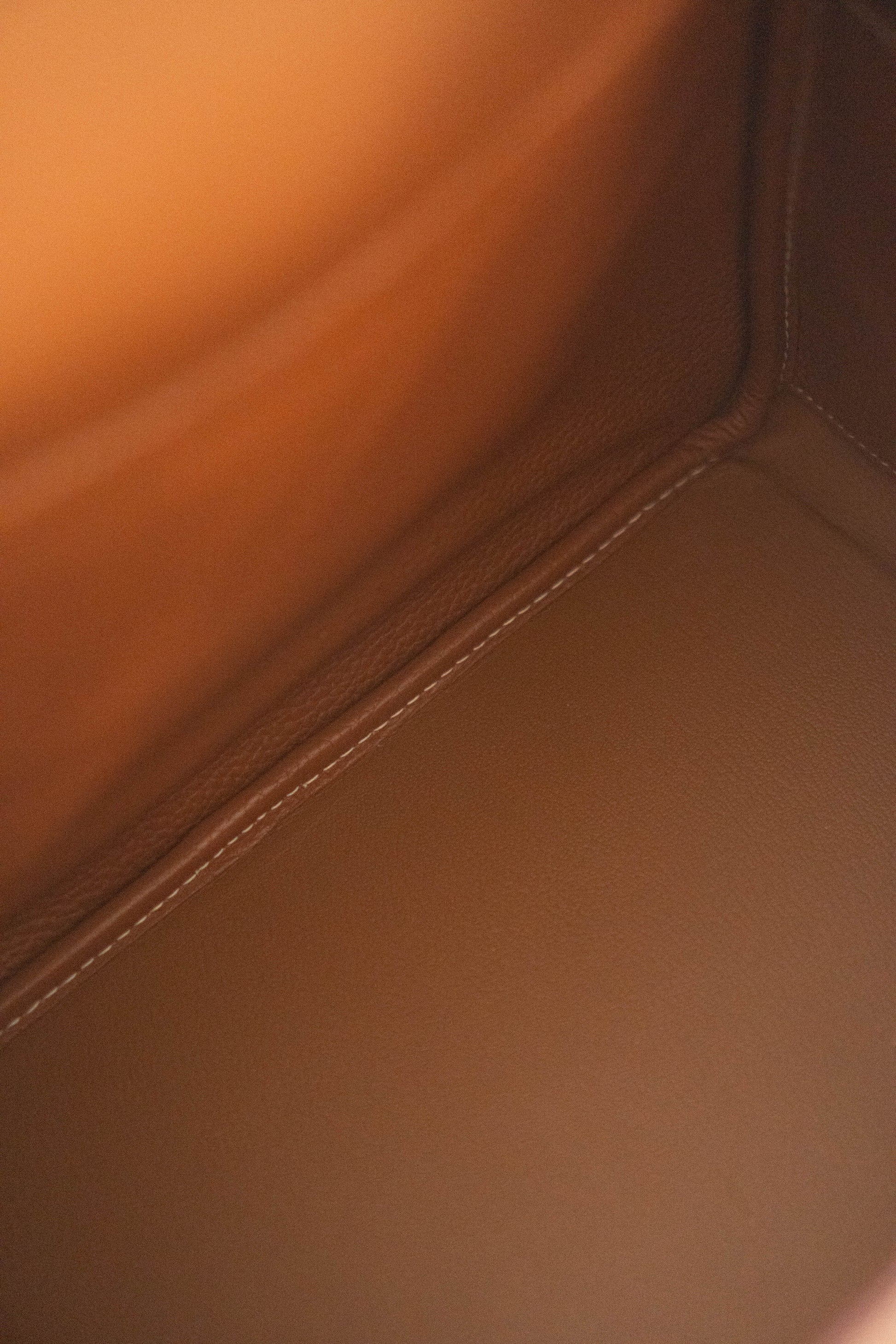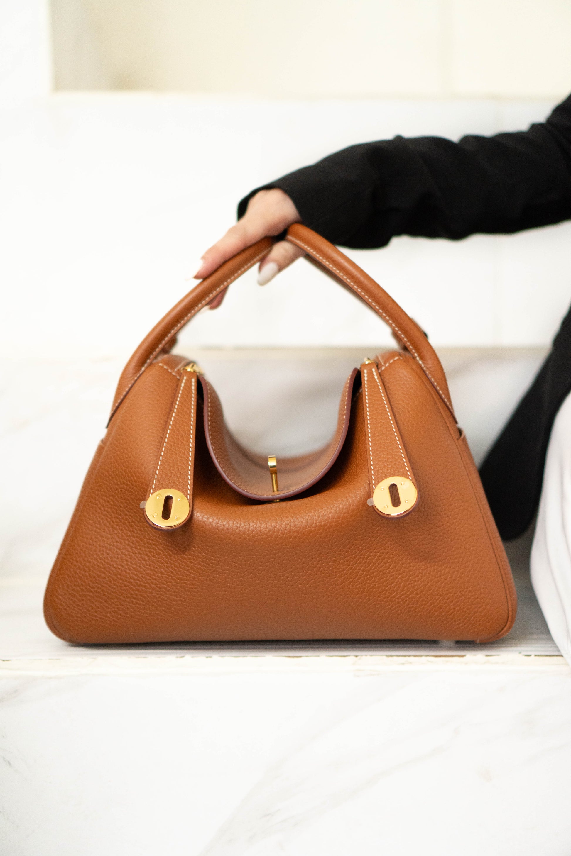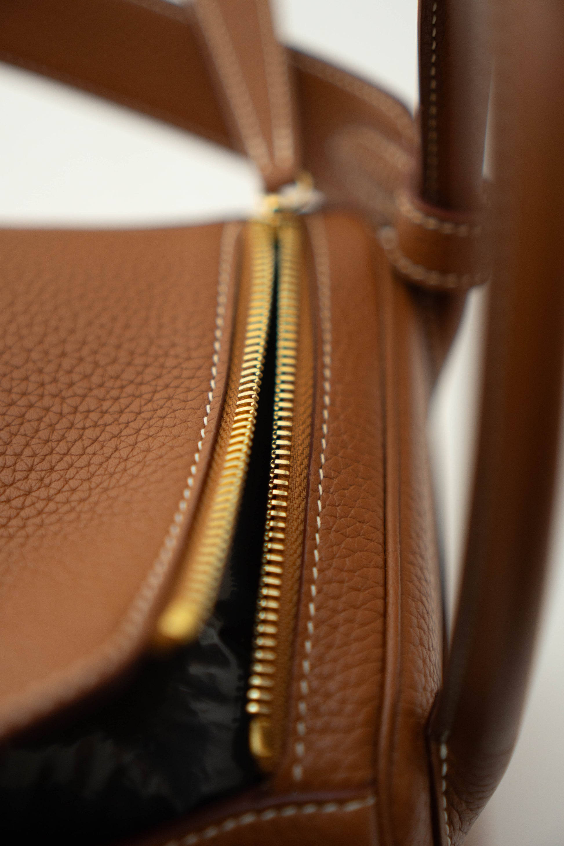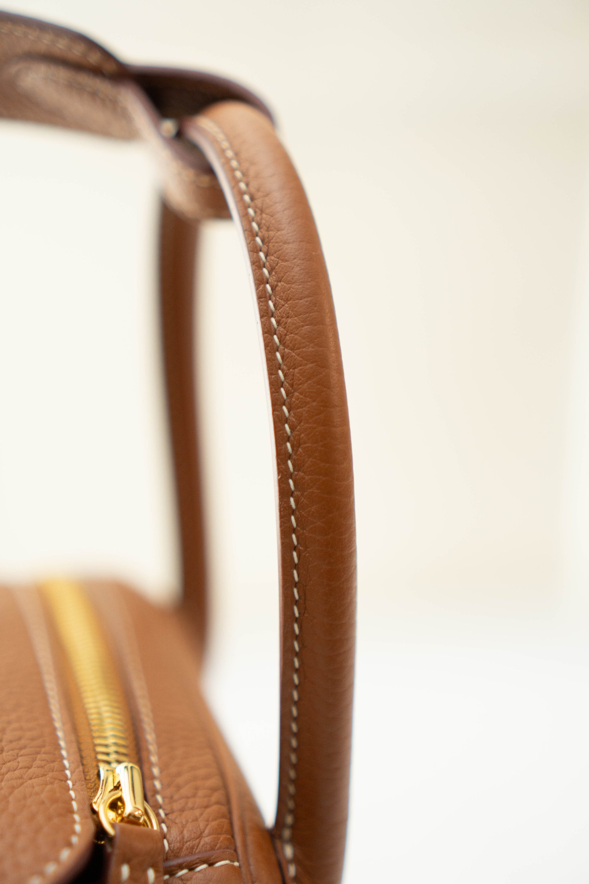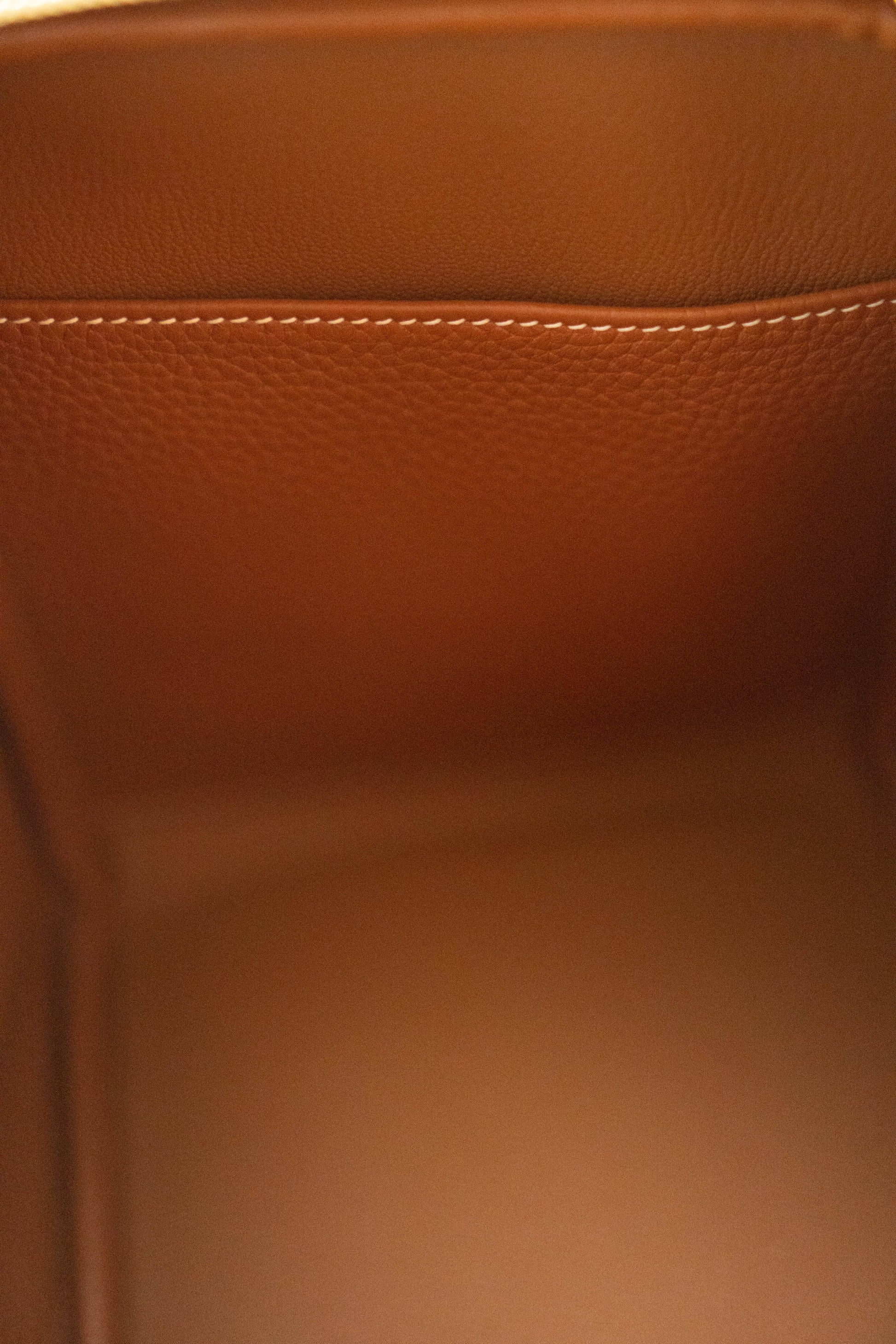 - Top Handles: Two rolled leather handles set into the sides of the bag.