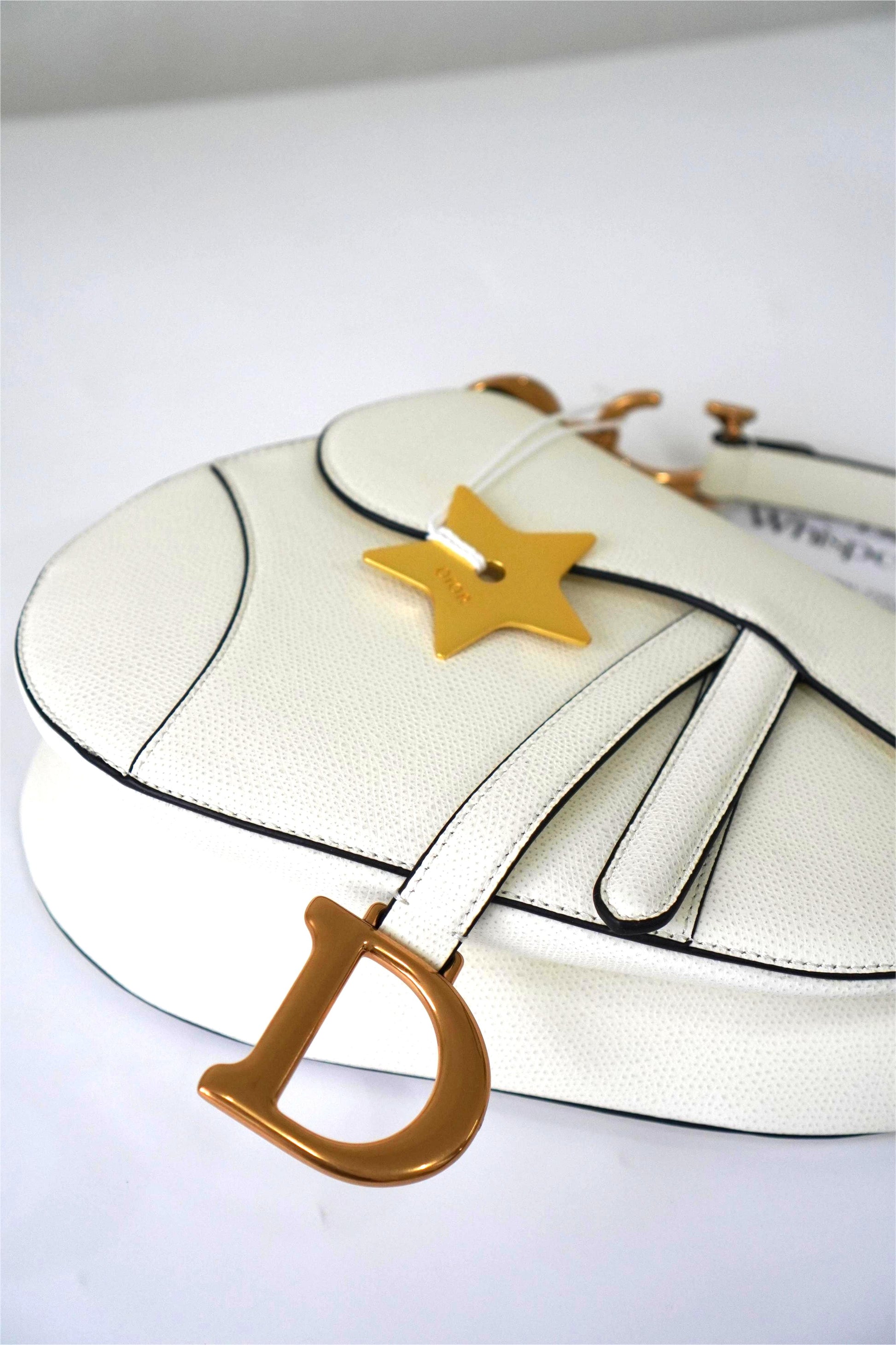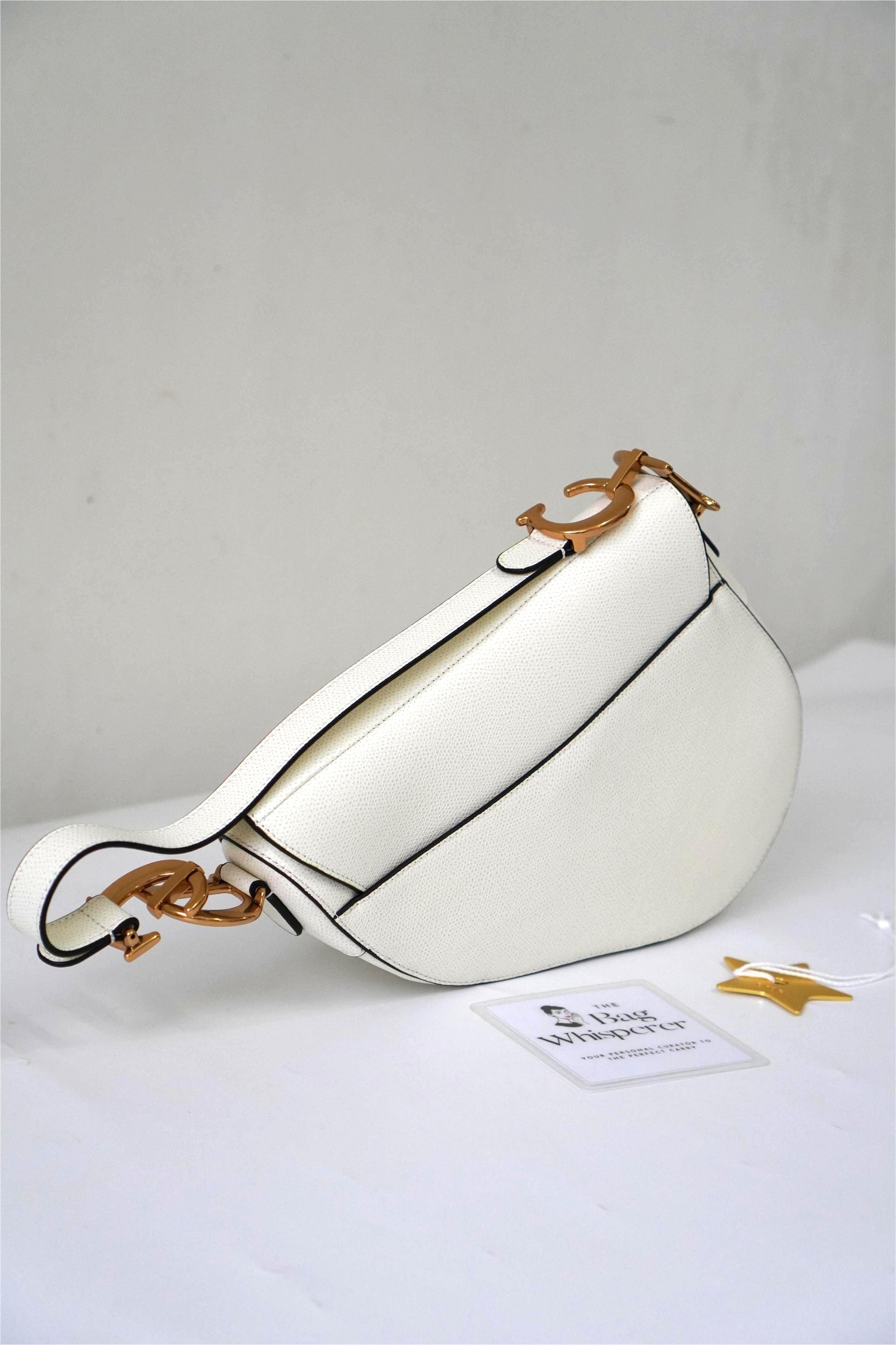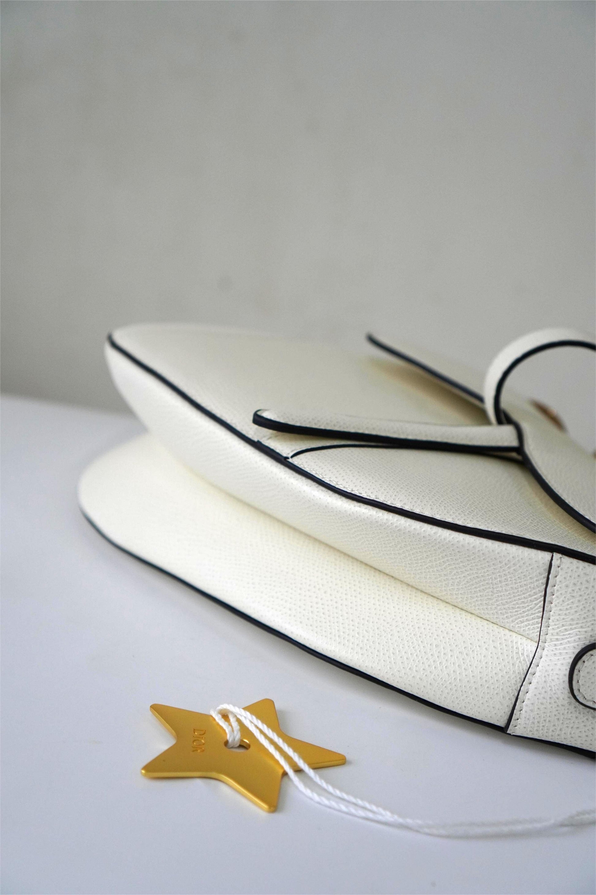 The Saddle Bag in White reimagines a modern icon with timeless sophistication. Crafted from textured calfskin leather, its sculptural silhouette is accentuated by clean black edging and signature curved lines. The luminous gold hardware adds a refined contrast, while the “D” charm detail enhances its statement appeal. Designed with a structured flap and short shoulder strap, this piece is both versatile and distinctive—perfect for adding polished style to any look.
