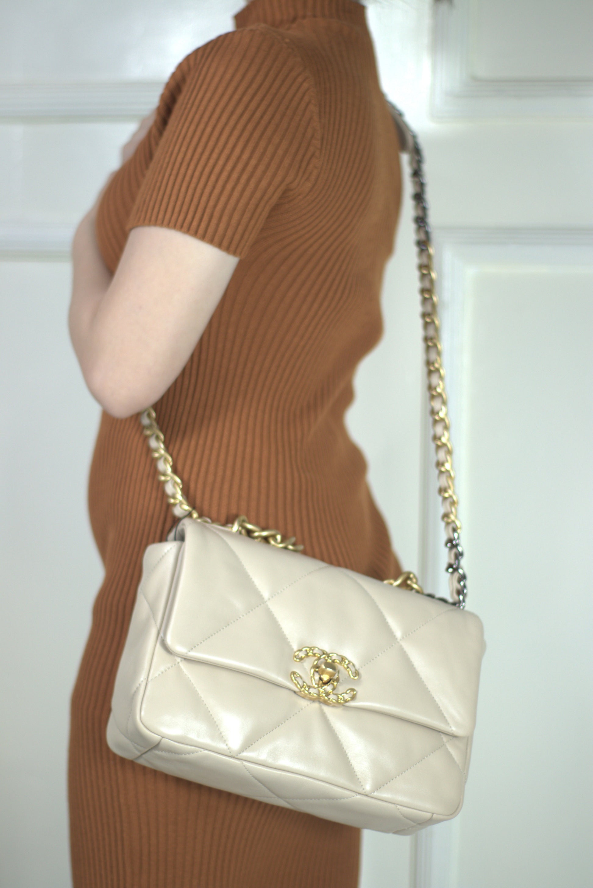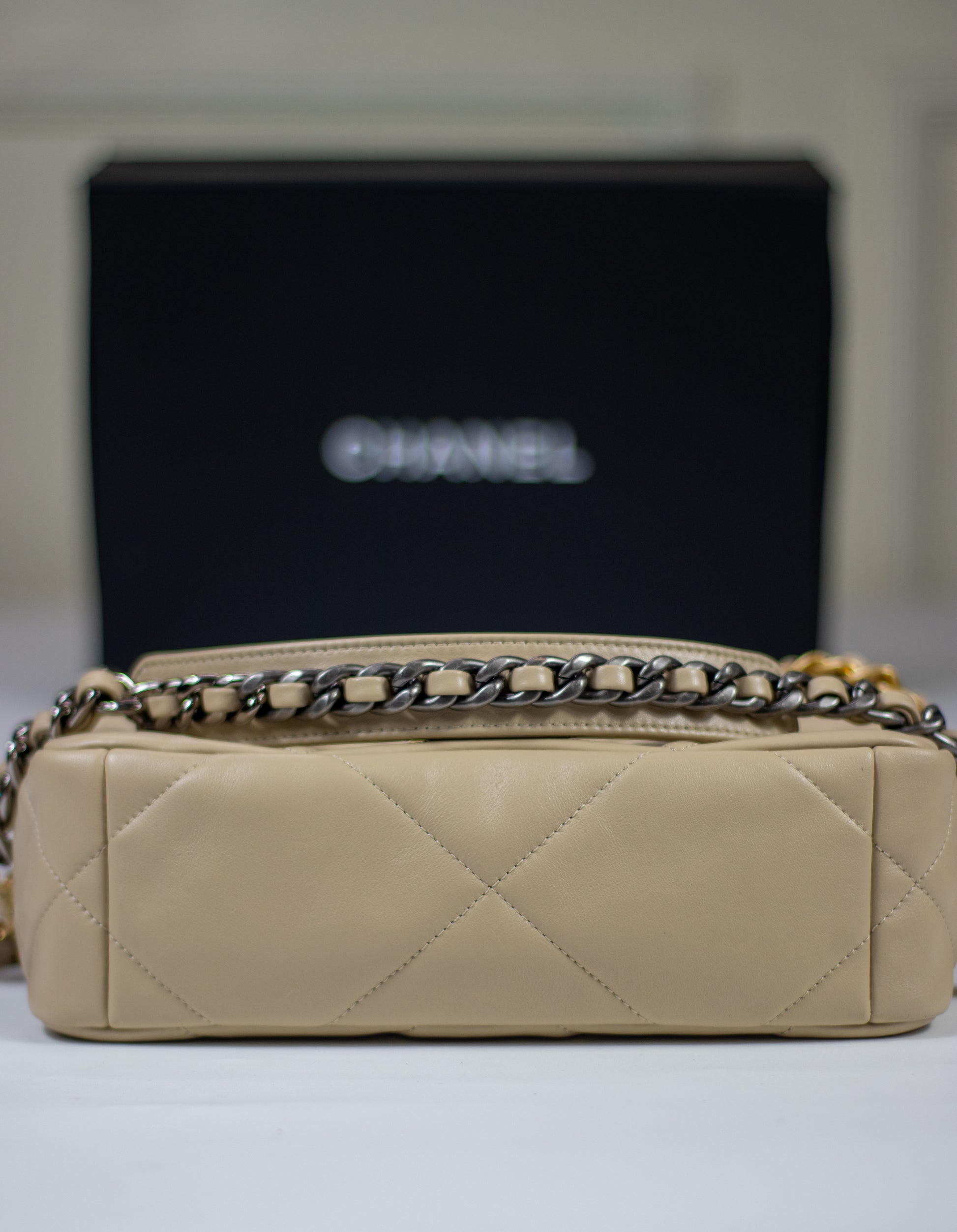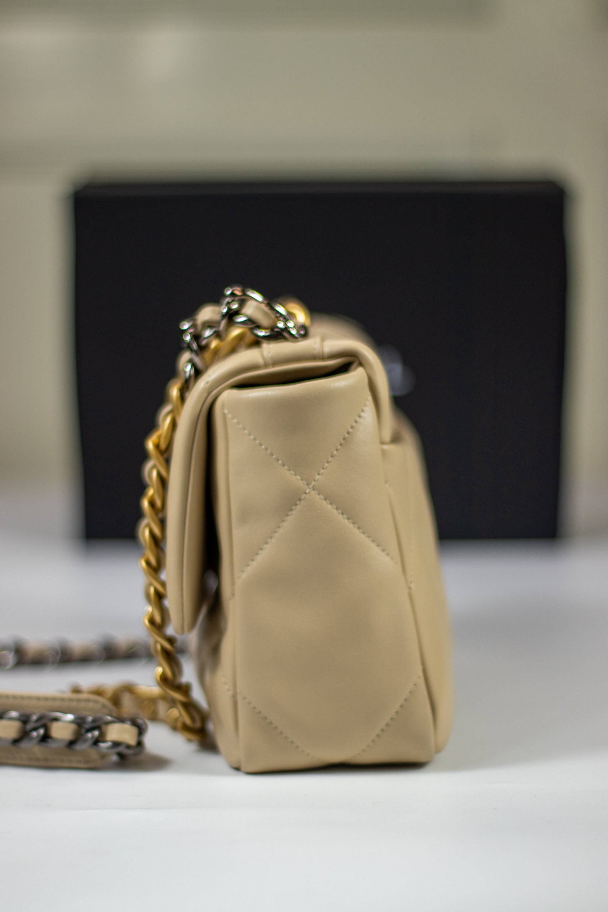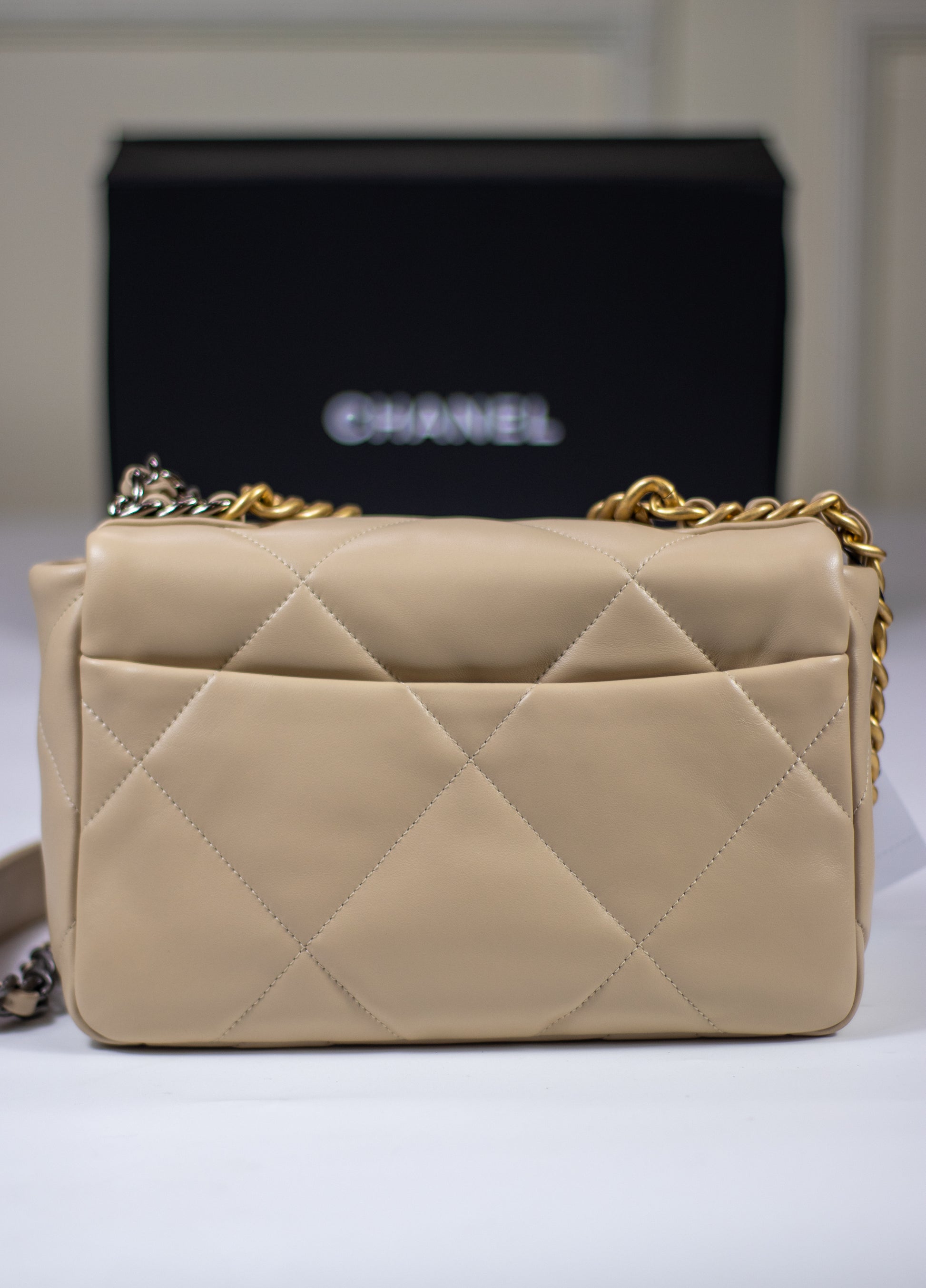 A modern classic reimagined for today’s style, this Small 19 Flap Bag in Beige Lambskin blends casual luxury with bold detailing. Featuring oversized diamond quilting, a soft yet structured silhouette, and a mixed-metal chain strap, it offers both edge and elegance. The buttery lambskin leather and signature turn-lock closure make it a standout piece for any occasion—perfect for elevating both daywear and evening looks.