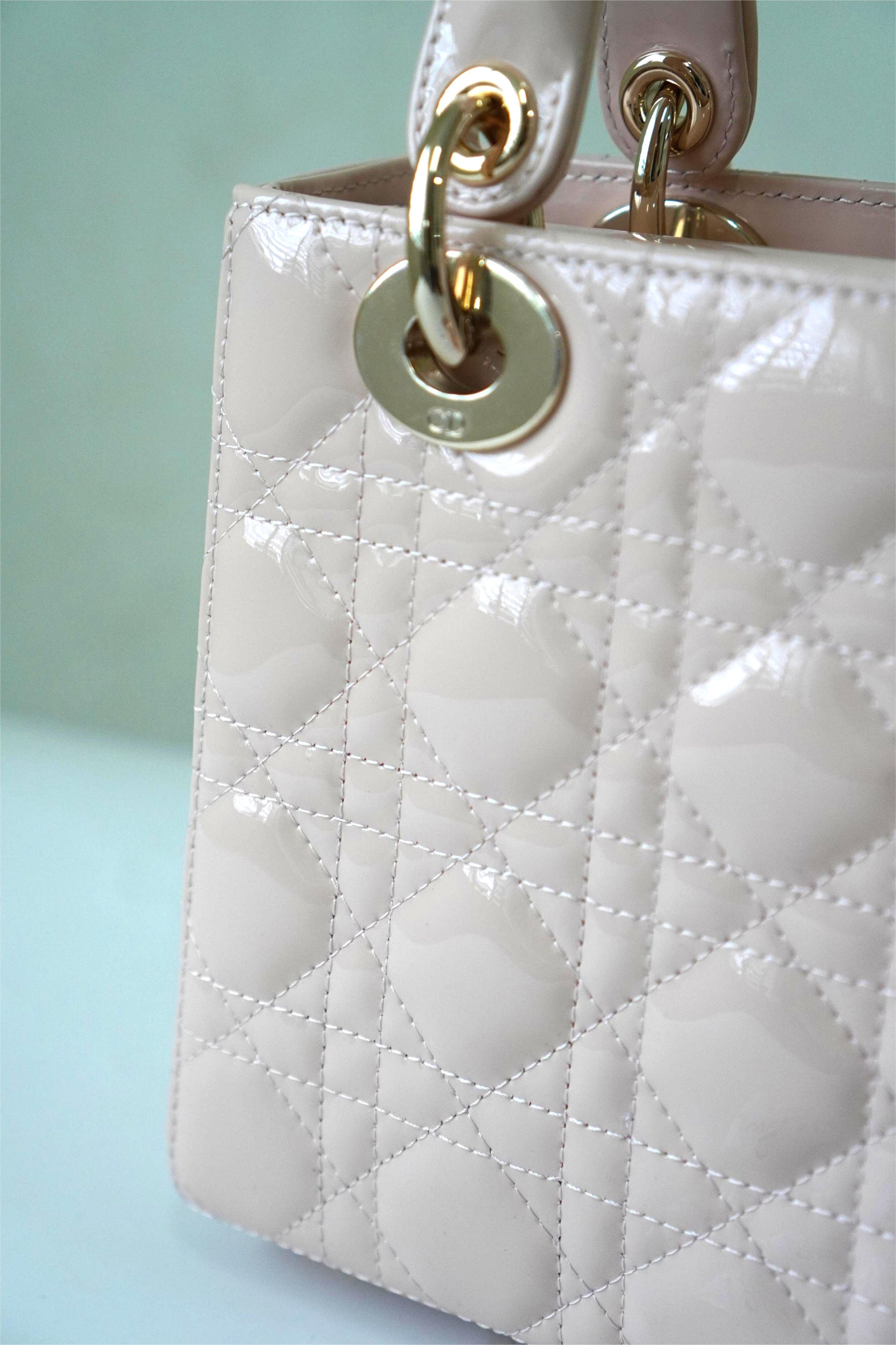 The Lady Dio R in Light Pink Patent Leather radiates timeless femininity with a modern edge. Its glossy patent finish enhances the iconic cannage quilting, while gold hardware and dangling charms bring refined elegance. Compact yet structured, this piece is perfectly suited for both day and evening wear, offering versatility with its top handles and detachable strap.