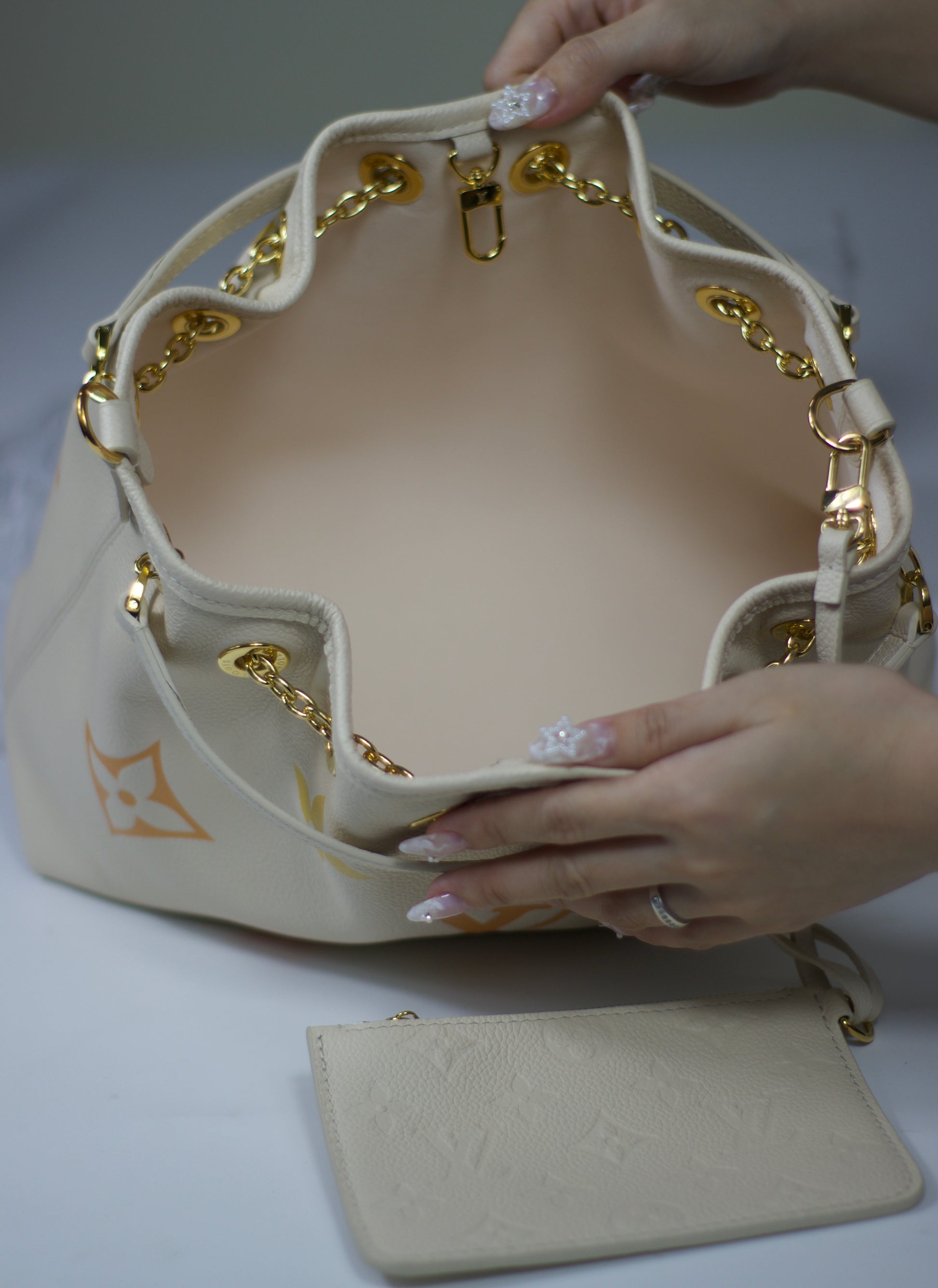 Fresh, fun, and full of sunshine vibes — this limited-edition LV Summer Bundle from the By The Pool collection brings effortless resort style to your everyday look. Featuring a soft cream base with vibrant orange and yellow Monogram accents, this set includes a drawstring shoulder bag and matching pouch. Made with premium materials that closely capture the luxurious texture of the original, this duo is both playful and practical.
