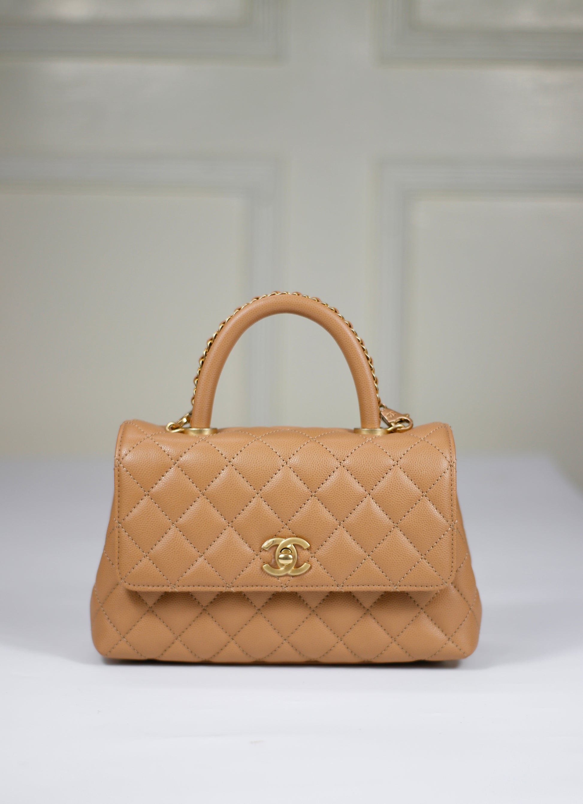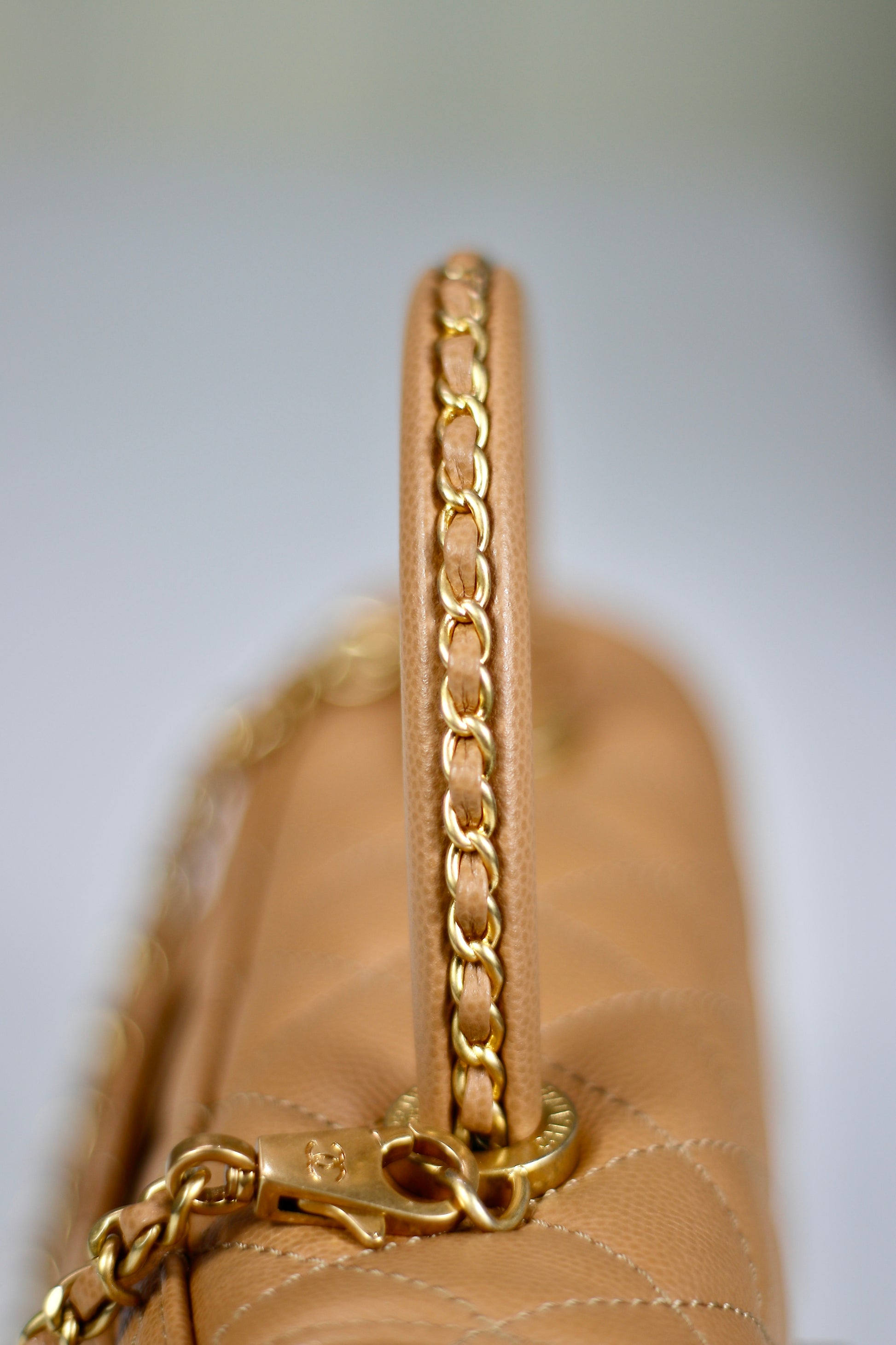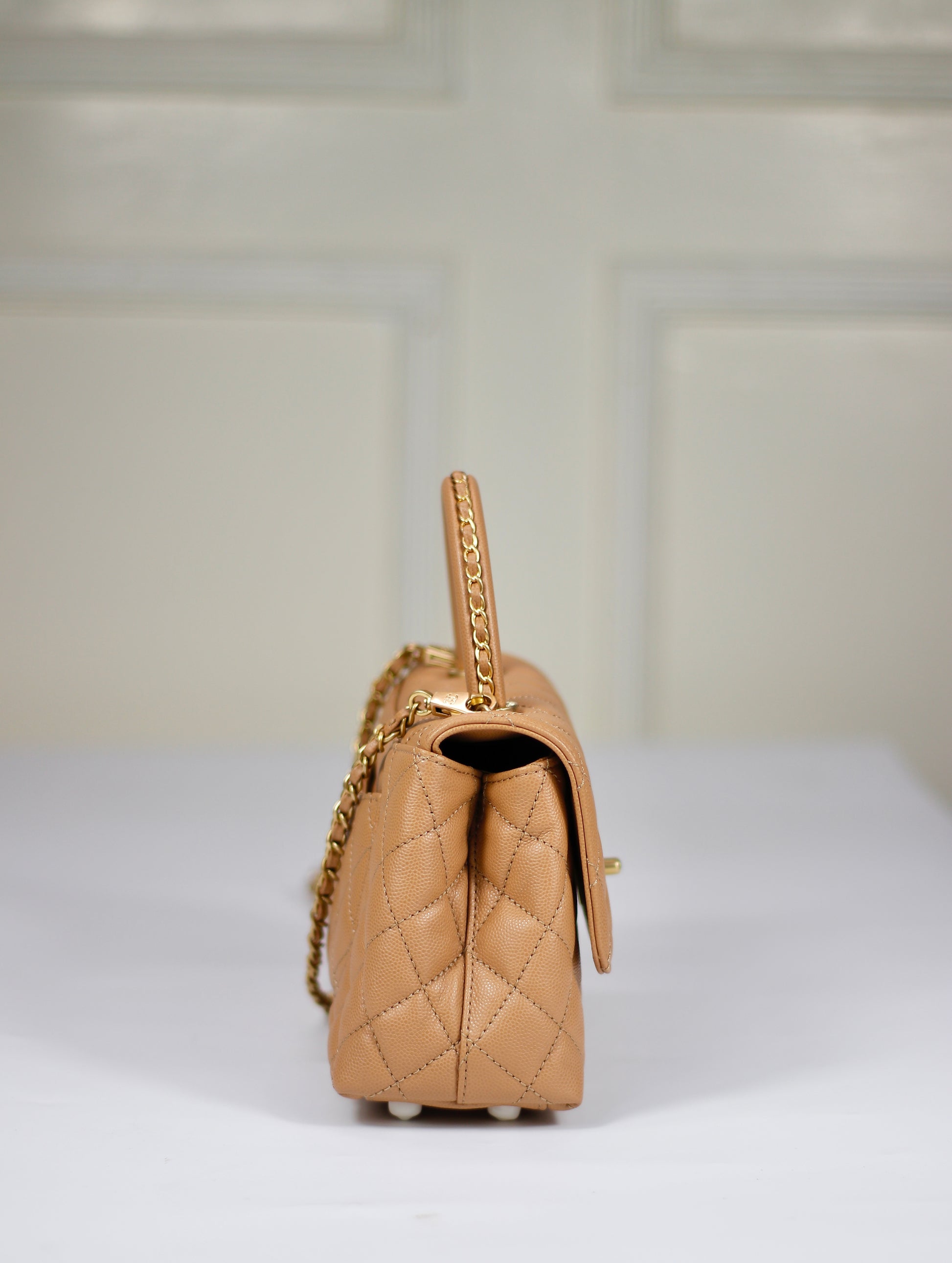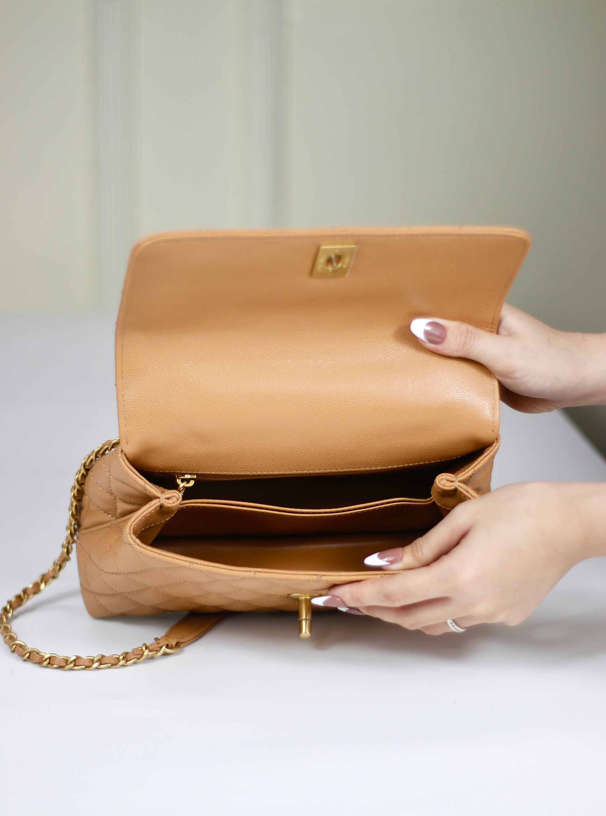 A timeless favorite with a modern twist. The Coco Handle in Caramel from the coveted 23P collection features durable caviar leather and luxurious gold-tone hardware. With its structured top handle and functional crossbody strap, this bag balances elegance and practicality.