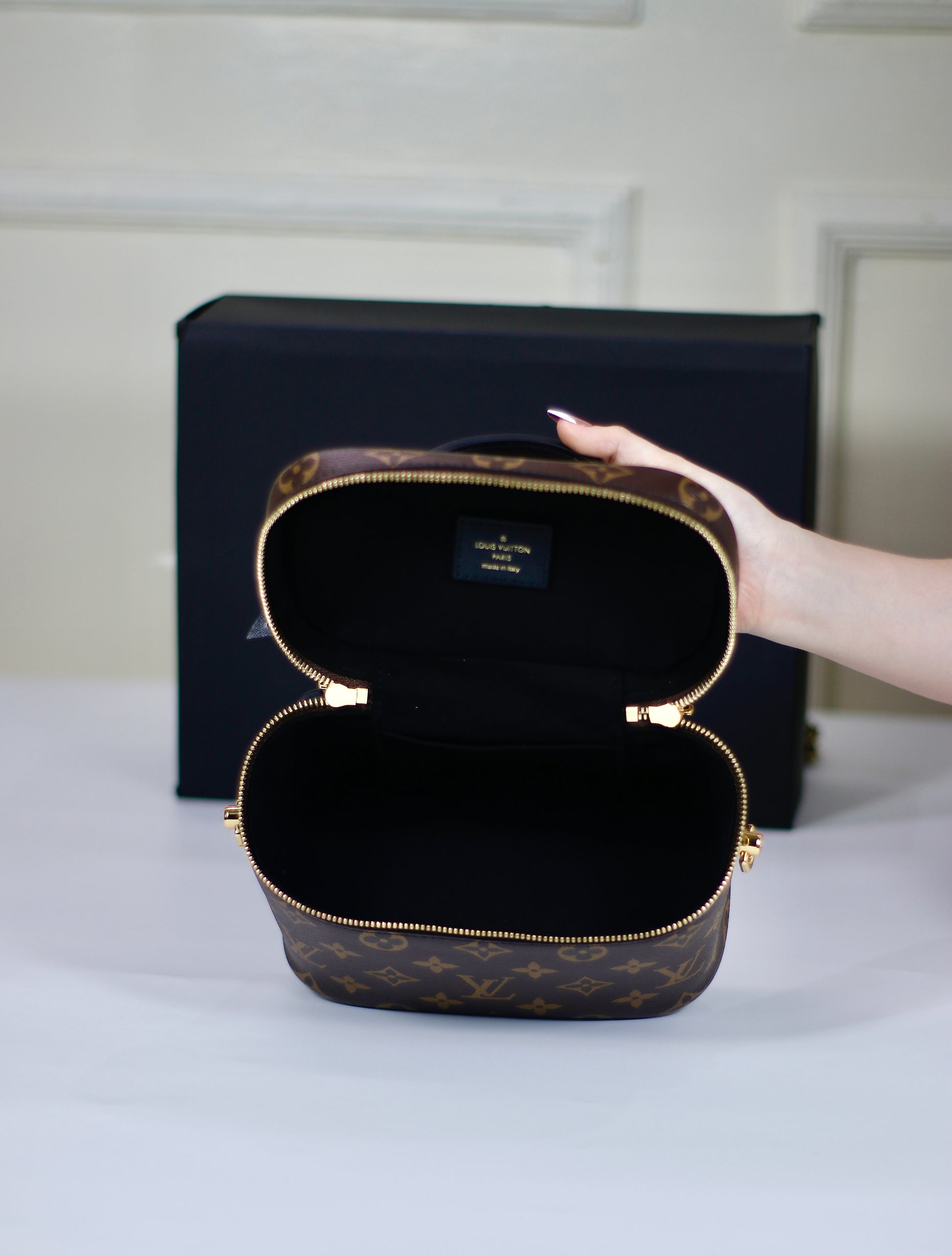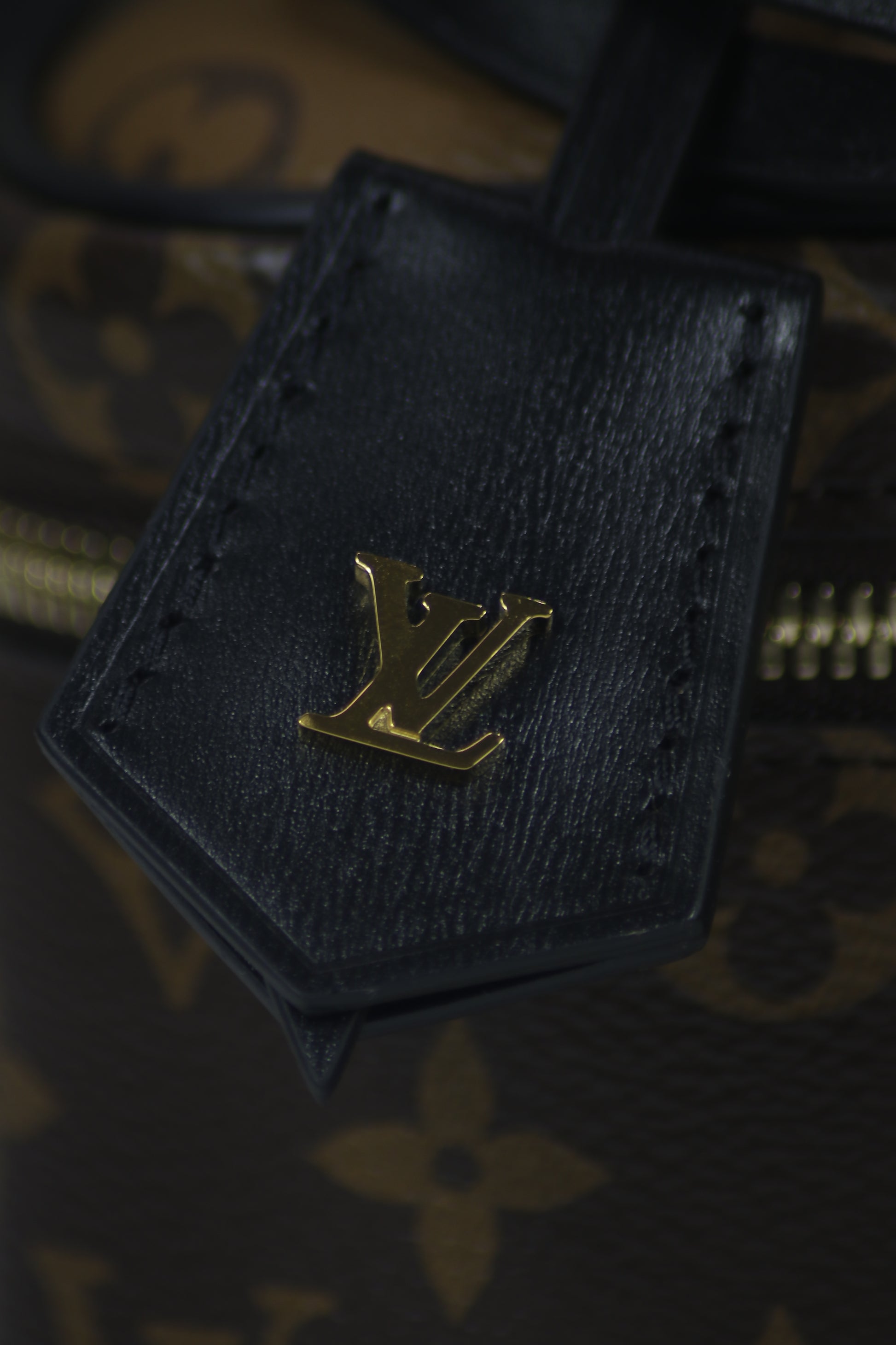 A modern reimagining of a classic silhouette. The Vanity PM blends the elegance of vintage travel cases with the everyday functionality of a compact crossbody. Crafted in Monogram canvas with sleek black leather trim, this structured beauty features gold-tone hardware, a removable leather tag, and a top handle for versatile styling.